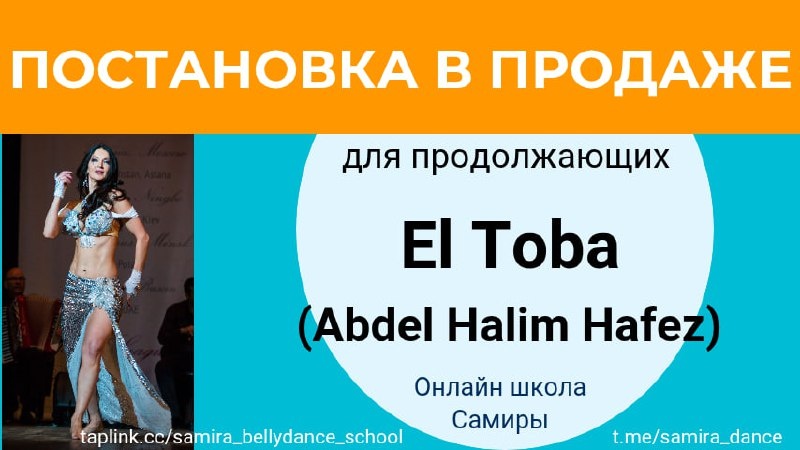 Дорогие друзья! В продаже появилась новая постановка на инструментальную версию песни Абдель Халим Хафеза - El Toba конкурсного формата. Приобрести ее можно на моем сайте - https://taplink.cc/samira_bellydance_school/p/6f40e8/ или ВК товары - https://vk.com/market/product/postanovka-el-toba-50773891-11901035 Ссылку на скачивание материала и чек вы получите как только сообщите мне об оплате в ЛС @SamiraDance или на почту samira1@mail.ru Если у вас не получается оплатить или есть другие вопросы - пишите в ЛС @SamiraDance или на почту samira1@mail.ru Демо-ролик: https://rutube.ru/video/c7f10295e0c15356067eeeedcd474e1d/ https://youtu.be/nTSKDDrVxOY