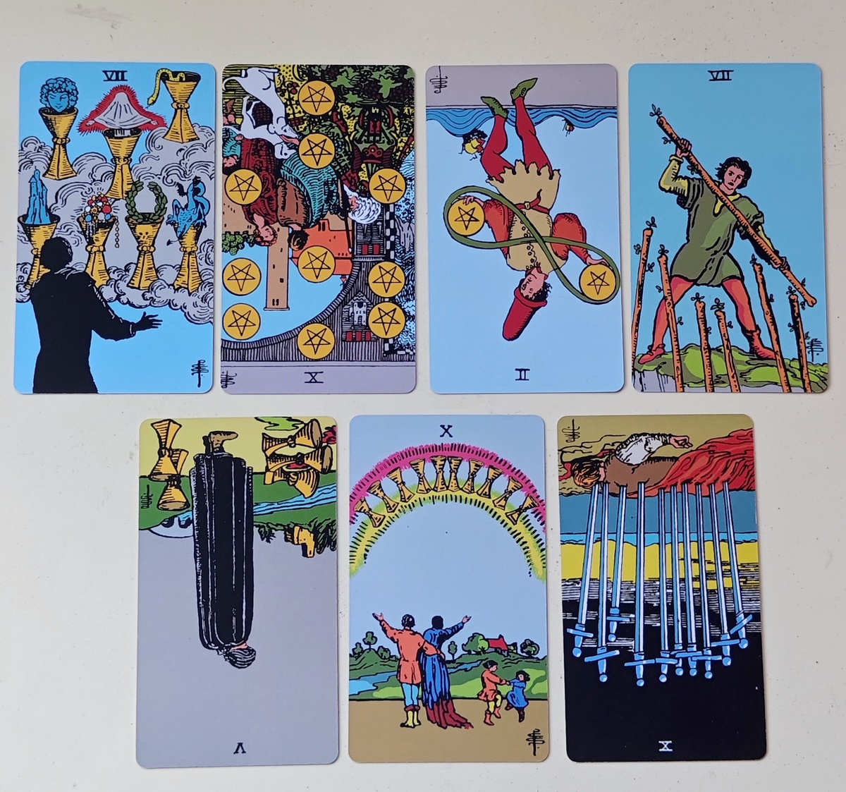 Здравствуйте уважаемые подписчики и гости моего канала.Меня Светлана и в сегодняшним общем раскладе мы посмотрим,какие сюрпризы готовит вам жизнь. Семерка Кубков показывает,что в прошлом у вас было много мечтаний и иллюзий.Вы ,вероятно,блуждали в мире фантазий,выбирая из множества возможностей.Это время,когда вы могли позволить себе немного пофантазировать и помечтать о том,что может быть. Перевернутая Десятка Пентаклей говорит,что в данный момент,похоже,вы сталкиваетесь с некоторыми трудностями в вопросах стабильности и материального благополучия.Возможно,семейные дела и финансовые вопросы требуют внимания.Но не переживайте,это временные трудности. Перевернутая Двойка Пентаклей рассказывает нам,что вы находитесь в состоянии неопределенности и перезаг