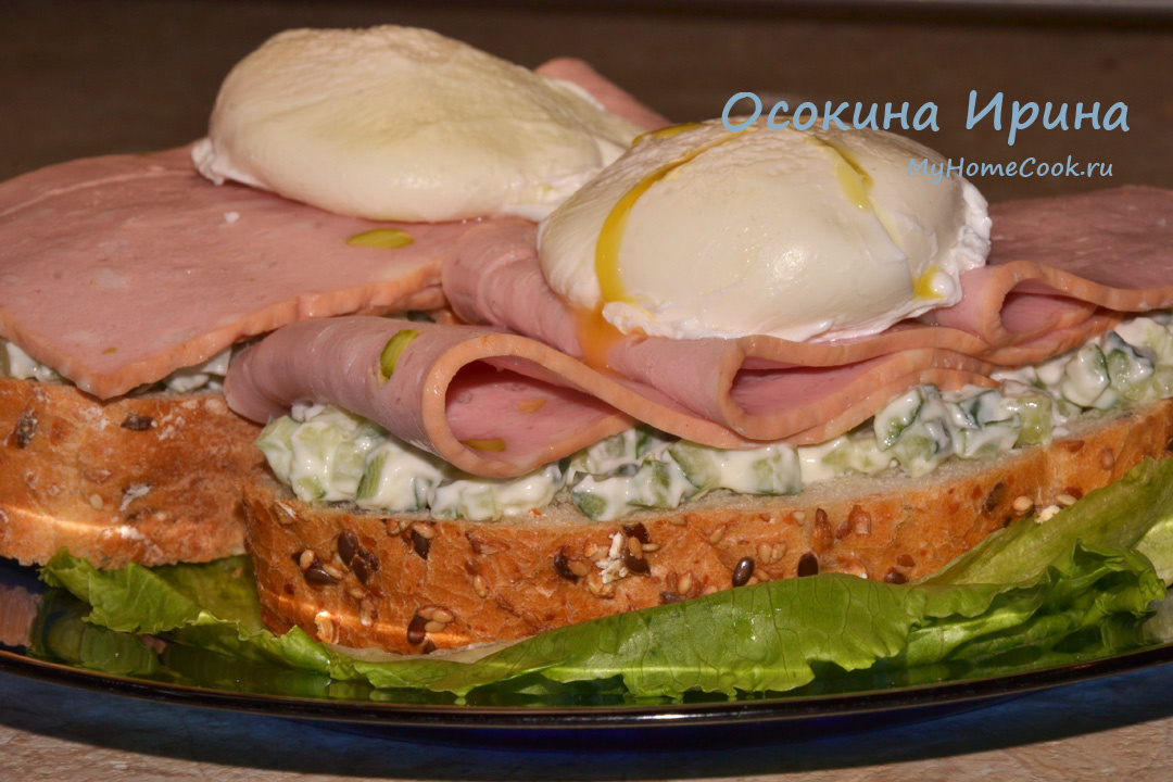 Когда есть немного времени для приготовления завтрака, стараюсь порадовать семью чем-нибудь этаким. Сегодня в миске смешала 3 ст.л. творожного сыра, горсть резаного зелёного лука и 2 свежих огурца мелким кубиком, промешала. Ломти зернового хлеба подсушила на сухой горячей сковороде, охладила, поверх разложила подготовленную массу, на неё уложила слайсы колбасы "Мортаделла" и венчала всё яйцами пашот. Умопомрачительно вкусный получился завтрак) Приятного аппетита