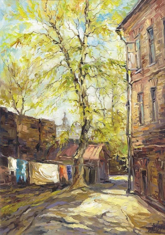 Июльское-дворовое Шептался ветер с пыльною листвой. Громада солнца по небу катилась. Соседский мальчик плелся за борзой. А под окном тряпьё-белье сушилось. Ленивый кот под ивою лежал. Старик читал вчерашнюю газету. А кто-то сонный молча озирал сомлевший двор июльско-душным летом. ___ Зоя Верт, 07.2016 ___ Картина Анны Чариной "Городской пейзаж" ___ #стихи #поэзия #лирика #творчество #зоя_верт #лето #июль #двор