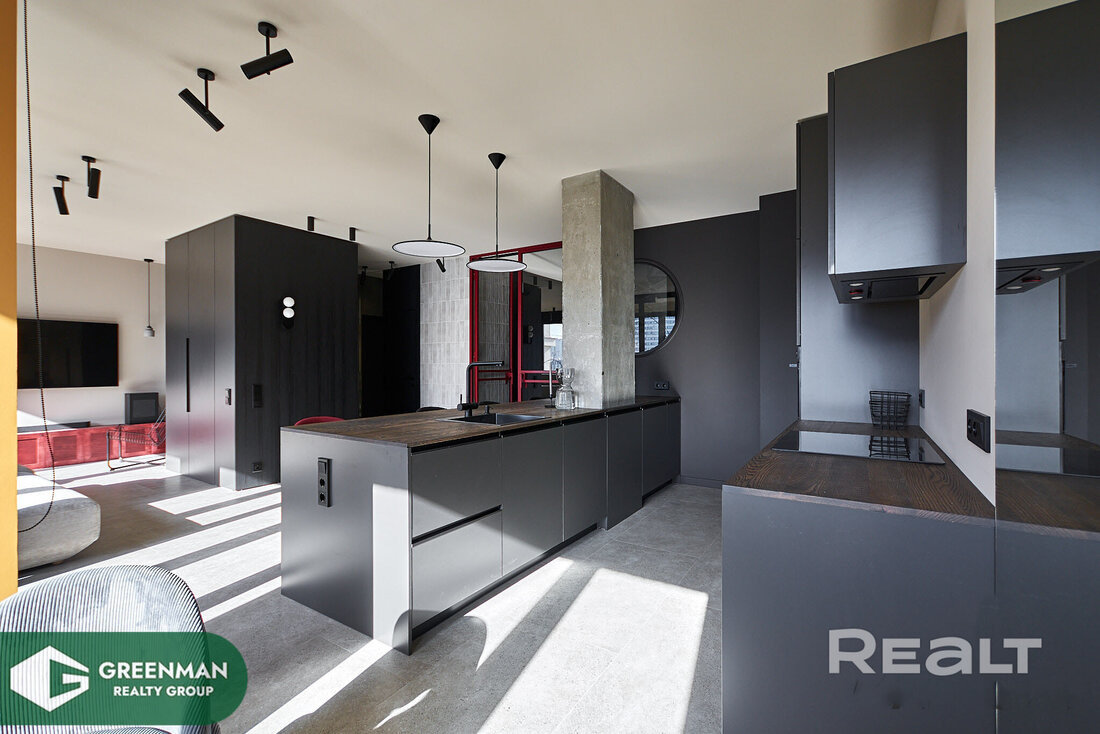 В Минск-Мире совсем рядом со станцией метро «Аэродромная» на продажу выставили евродвушку с нестандартным ремонтом. Здесь сочетаются яркие контрастные цвета, а еще в интерьер гармонично вписали бетонную колонну. Метр в этой квартире стоит около двух с половиной тысяч долларов. А сколько стоит квартира? Рассказываем. Это дом «Сидней Люкс» в «Квартале Чемпионов». В нем 25 этажей и построен он в 2020 году. До станции метро «Аэродромная» — пару минут. Рядом соответственно и торговый центр Avia Mall (в прошлом месяце мы о нем рассказывали). Общая площадь квартиры — 63 квадрата. Гостиная совмещена с кухней, но при этом имеет зонирование из-за кухонного острова. А за стеклянными дверьми — спальня. Кухонные фасады выполнены в матовом черном цвете. Из техники в кухне есть строенный холодильник, духовой шкаф с функцией СВЧ, посудомоечная машина, вытяжка и варочная панель. Установлены фильтры. Здесь же находится та самая бетонная колонна. Интересно организована и зона отдыха. Прямо у окна стоит д