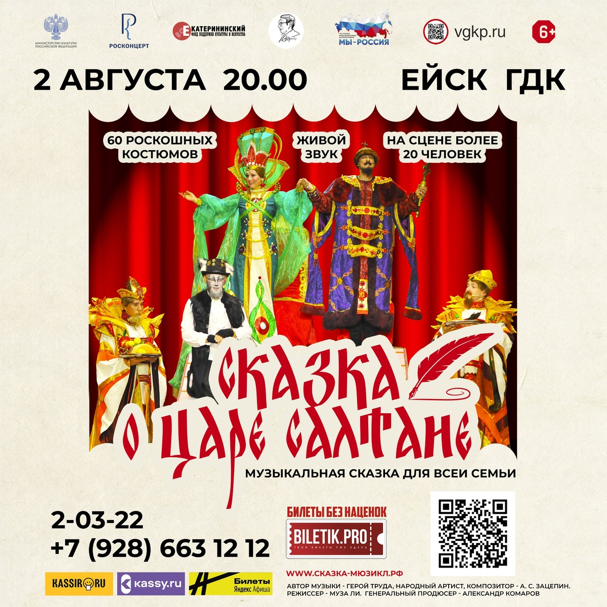 2 августа в 20:00 Сказка о царе Салтане Билеты можно приобрести в кассе по адресу: ул. Свердлова, 73/1, а также онлайн Цена: от 600₽ Справки по тел.: касса — 8 (86132) 2-03-22. Режим работы: с 11:00 до 18:00. Cказочная феерия мюзикла, магия стихов А. С. Пушкина, фантастическая музыка Героя труда, Народного артиста и композитора А. С. Зацепина, любимые герои «Сказки о царе Салтане» Герои мюзикла уже готовы выйти на сцену. Вы в предвкушении? Тогда будьте уверены: это будет настоящий праздник — путешествие в волшебный мир сказки и музыки!