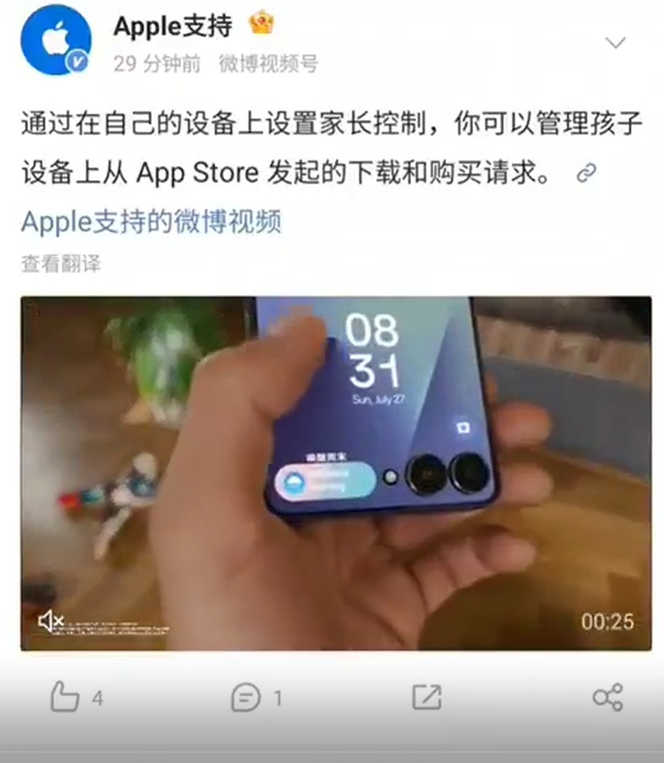 Очередные маркетинговые приключения Apple. Компания решила напомнить своим подписчикам в китайской соцсети Weibo о функциях родительского контроля, но приложила к посту видеорекламу Samsung Galaxy Z Flip 7.