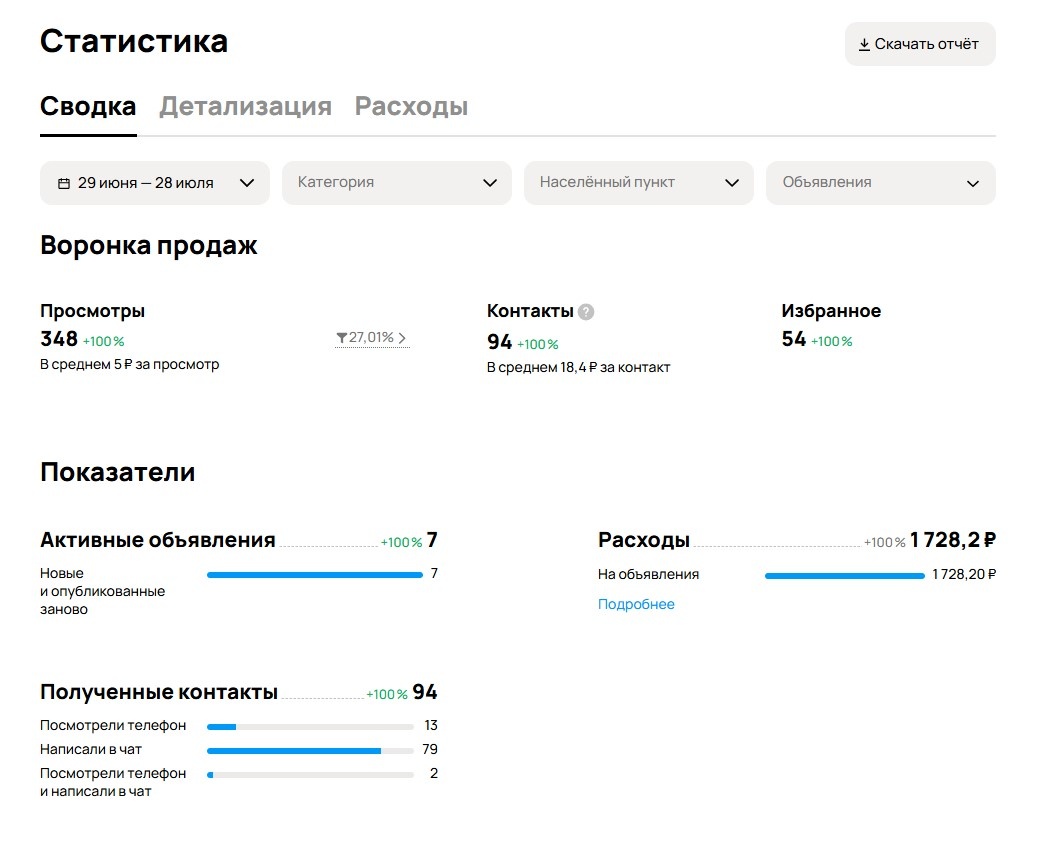 А при условии, что я всем клиентам Авито оплачиваю и веду бесплатно в качестве бонуса, для них это в целом, бесплатные заявки. Вот сводка за месяц. 94 контакта получено по 20 рублей. 1 объявление в этой нише стоит примерно 400 рублей. В июле оплач
