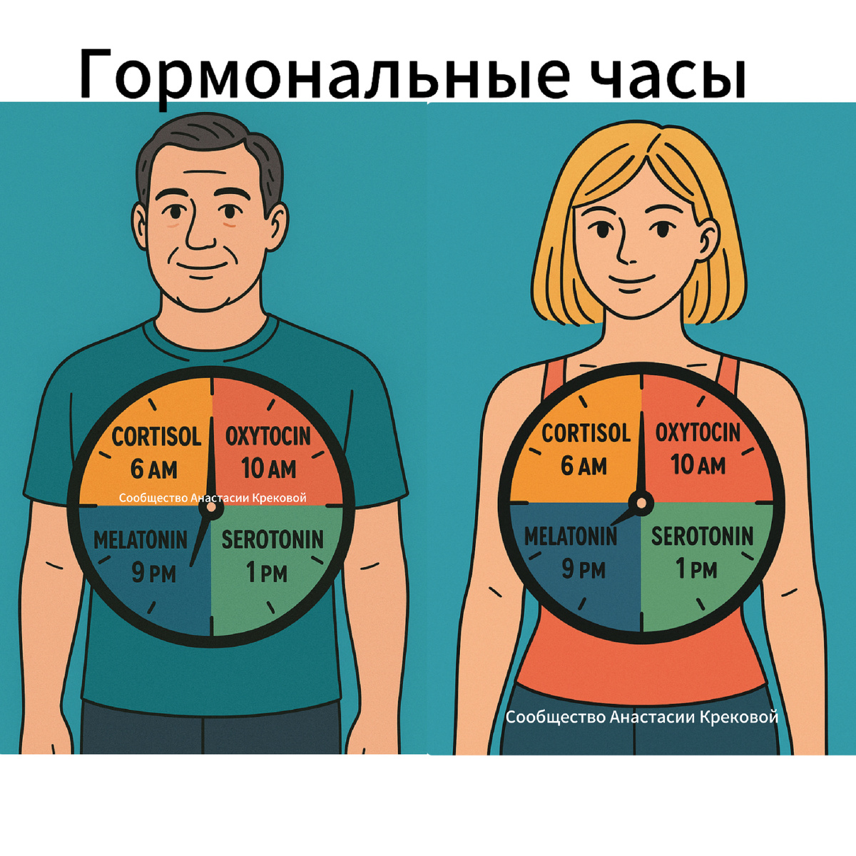 * **Визуал:** Обязательно предложите создать яркую картинку/коллаж (гормоны как часы, графики выброса, утро/вечер). Можно сделать инфографику-шпаргалку по расписанию.