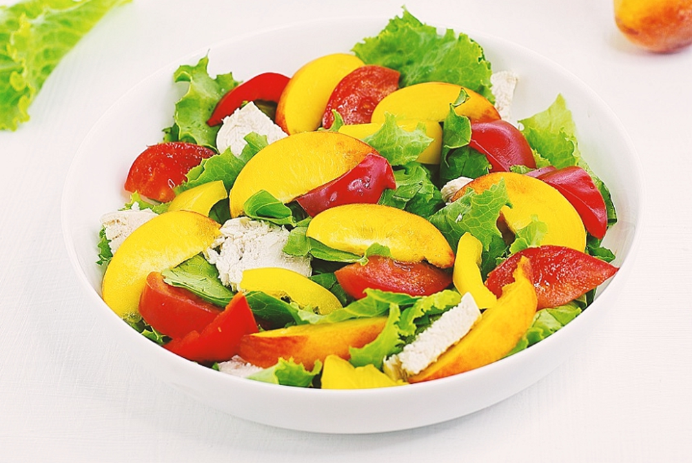 Подготовить необходимые ингредиенты для приготовления летнего салата на праздничный стол. В составе рецепта - свежие сезонные овощи, ароматные персики и куриное филе.
