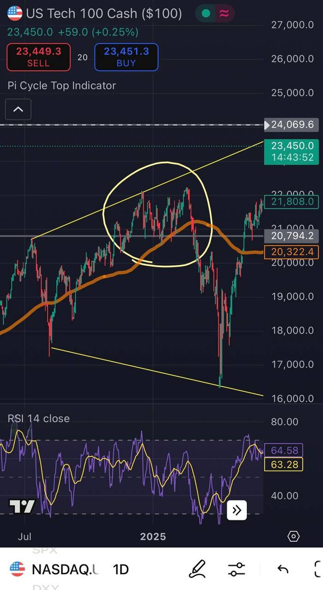 Как выглядит фаза дистрибьюции? Разберём на графике В прошлом посте я писал, что на фондовом рынке в ближайшие 4–6 недель может начаться фаза дистрибьюции. А теперь давайте посмотрим — как она выглядит на графике. На скрине — дневной график NASDAQ. Отмеченная зона — типичная дистрибуция: — рынок уже на исторических максимумах — цена пилит в узком диапазоне — нет импульса вверх, но и не сливают — RSI не перекуплен, но держится высоко — крупные уровни постоянно тестируются, но без подтверждения Именно так работает крупный капитал: он не продаёт одним ордером, он выходит партиями, используя ликвидность, которую создают толпа и новости. Это не разворот по классике. Это борьба на вершине, где жадность с одной стороны и хеджирование с другой. Выглядит не страшно. Даже обнадёживающе. Но если вы видите такую структуру после сильного тренда — это уже не вход, это потенциальный выход. Что будет дальше? — Сначала может быть ложный пробой вверх — чтобы “вытащить последних” — Затем — снижение