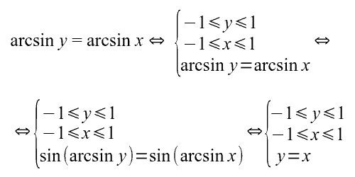 Функция арксинуса определена для аргумента, принимающего значения от –1 до 1. Сам арксинус есть угол от –π/2 до π/2, причём каждой отдельной величине угла соответствует только одно значение аргумента. На основании этого у обеих частей заданного уравнения можно найти синус, не изменив при этом смысла самого уравнения:
