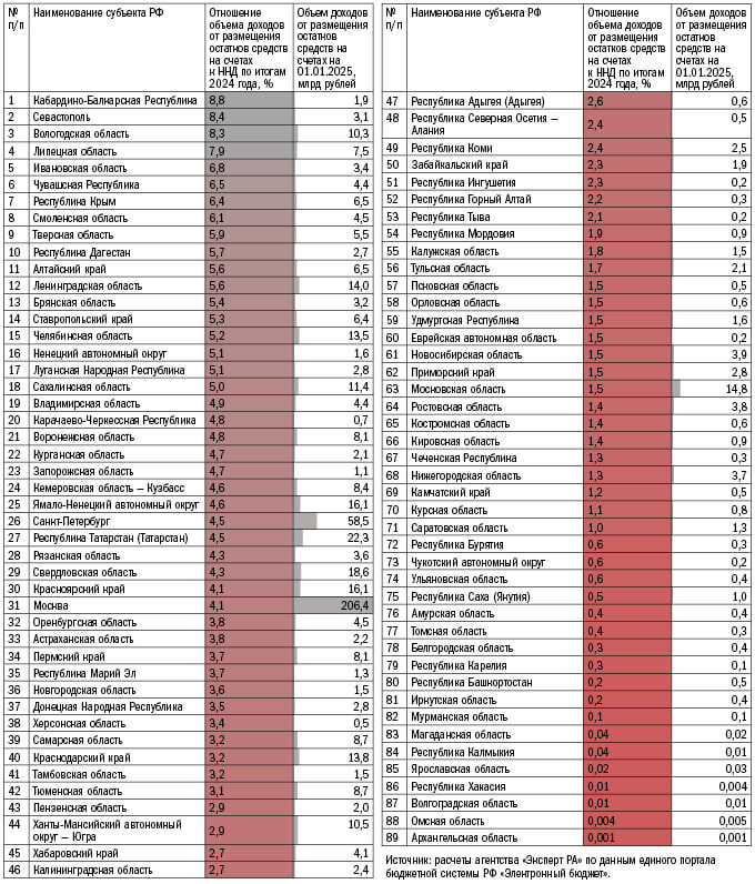 "Эксперт РА": Доходы cубъектов РФ от размещения средств на счетах бюджета выросли в 66 регионах