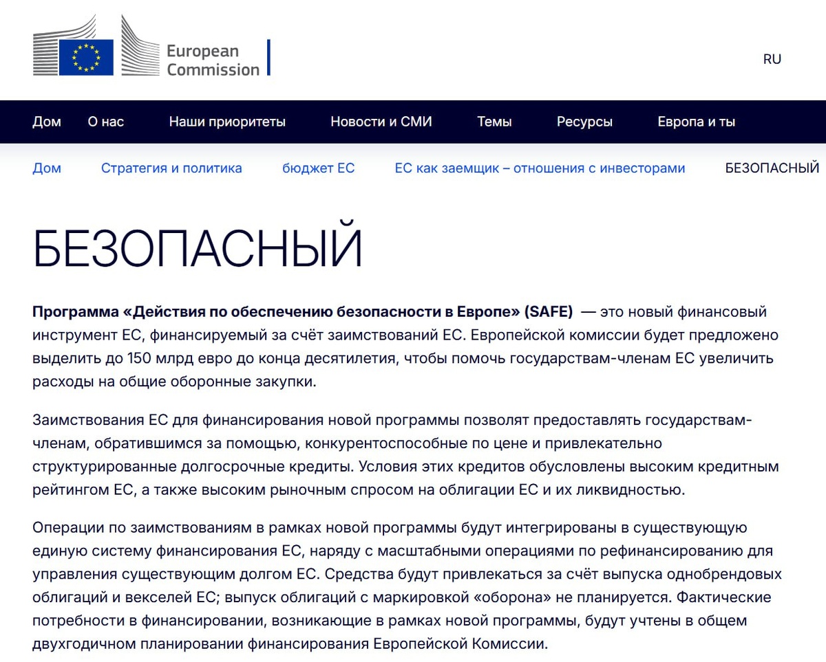 🇪🇺💶 ЕС влезает в долги ради Украины — запускается оружейная кредитка SAFE 🔻 Евросоюз запускает новую масштабную программу под названием SAFE — Strategic Technologies for Europe Platform. Её цель — профинансировать оборонные закупки на десятки миллиардов евро за счёт коллективных заимствований. 🔻 Программа рассчитана на до €150 миллиардов, которые будут выделяться в виде льготных кредитов странам ЕС. Эти деньги пойдут: ▫️ на поддержку Украины — вооружение, боеприпасы, дроны; ▫️ на развитие европейской оборонки — укрепление собственной военной промышленности и снижение зависимости от США. 🔻 SAFE — часть широкой стратегии Readiness 2030, также известной как ReArm Europe. Её основная задача — превратить оборонную отрасль Европы в самостоятельную силу, способную быстро и масштабно реагировать на угрозы. 🔻 Механизм SAFE напоминает коллективную рассрочку: ▫️ каждая страна ЕС может получить долгосрочный кредит на закупку вооружений; ▫️ аванс возможен до 15 % суммы; ▫️ возврат займа