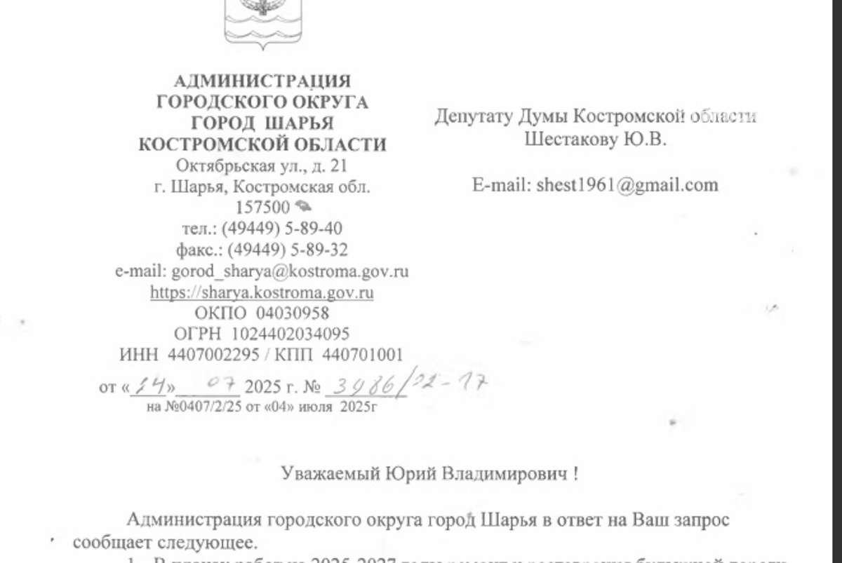 Получить ответ на свой вопрос шарьинцы смогли через областного депутата. Напомню, депутат областной Думы Юрий Владимирович Шестаков проводил в Шарье личный прием граждан 18 июня. После этого народный избранник сразу приступил к выполнению своих обещаний. Юрий Владимирович направил официальные запросы в различные ведомства в зависимости от темы озвученных шарьинцами проблем. Так, был вначале получен ответ о невозможности установки МРТ-оборудования на базе Шарьинской ЦРБ. Сейчас депутатом получен официальный ответ от имени главы городского округа города Шарья. У администрации парламентарий интересовался расселением граждан из домов по двум адресам, признанных аварийными, ремонтом булыжной дороги по ул. Чапаева, а также качеством воды в п. Соколовский. По Соколовскому депутата перенаправили в администрацию Шарьинского района, а вот по другим вопросам получены ответы. Булыжную дорогу сделать в рамках программы "Создание комфортной городской среды" Шарья – столица мира Крупнейшее городс