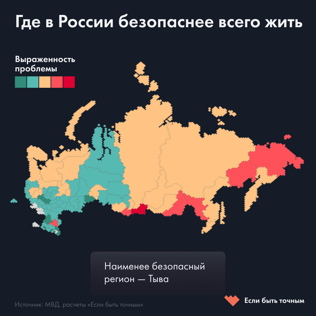 В 2024 году самый высокий уровень преступности в 2024 году был в Тыве, на Чукотке, в Еврейской автономной области, Амурской и Магаданской областях. Тыва — многолетний лидер по уровню преступности: в прошлом году там на 100 тысяч человек пришлось 162 жертвы убийств и тяжких нападений. Это в 12,5 раза больше, чем в Москве. За год в Тыве число жертв преступлений снизилось незначительно, как и число погибших и получивших тяжкий вред здоровью. Однако раскрываемость тяжких преступлений упала с 76% до 59%. 🔸Самые безопасные регионы — Ингушетия, Дагестан, Рязанская область, Москва и Подмосковье, Кабардино-Балкария, Курганская и Ростовская области, а также республика Адыгея. В кавказских регионах низкое потребление алкоголя, а еще сильные семейные и клановые связи. Это помогает решать бытовые конфликты без полиции. Москвичи и жители Московской области реже других россиян преступают закон: это может быть связано с уровнем благосостояния жителей и другими особенностями жизни в столице. 🔸Мы не в