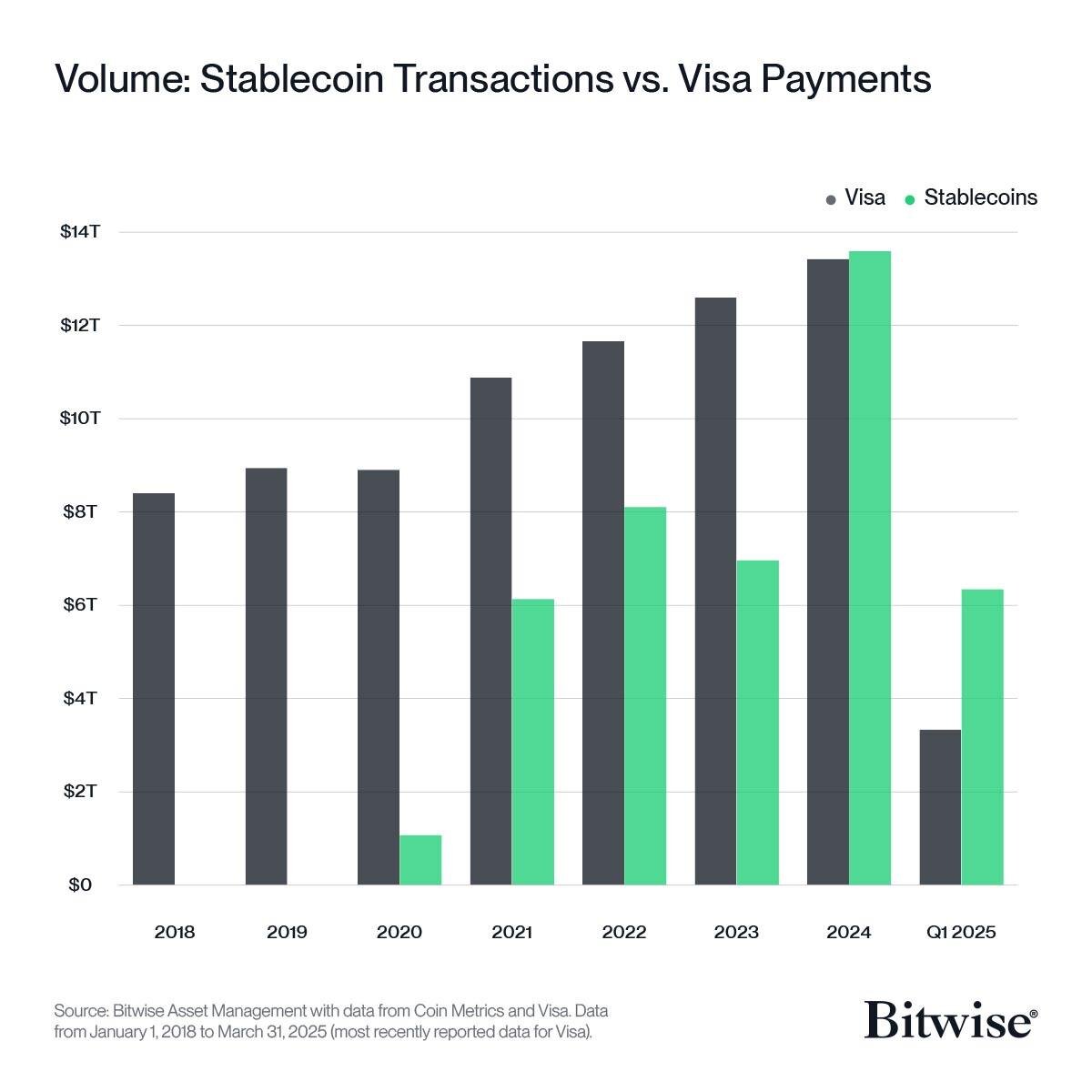 🔸Объем операций в стейблкоинах ($6 трлн) в первом квартале 2025 года вдвое выше чем объем у Visa — отчет Bitwise