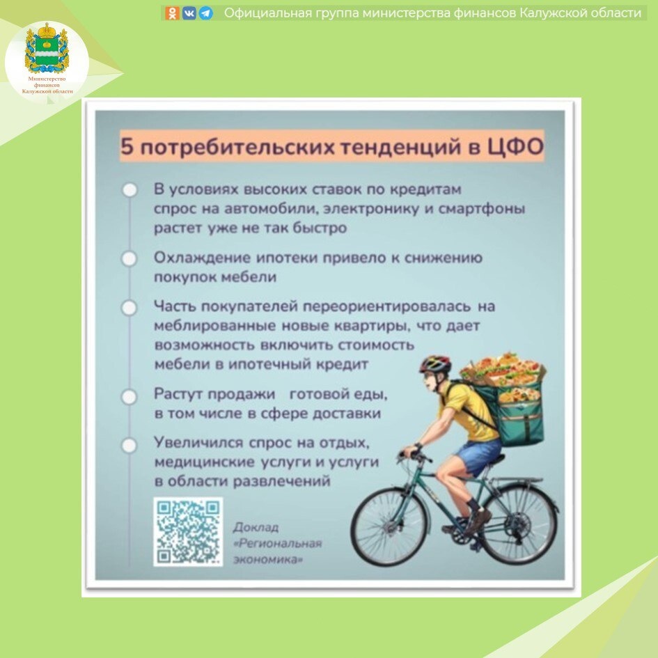 🛍️ В ЦФО меняется потребительский спрос — и это касается каждого Летом традиционно планируют крупные покупки, но в этом году спрос на технику, мебель и ремонт в регионах ЦФО заметно замедлился. Причина — высокие ставки по кредитам. Люди всё чаще откладывают «крупные траты», выбирая подождать и не переплачивать. Зато услуги — поездки, кафе, кружки, развлечения — остаются востребованными. Их покупают за счёт доходов, а не кредитов, поэтому спрос здесь устойчивее. Этот сдвиг помогает сдерживать рост цен. По прогнозам калужского отделения Банка России, к 2026 году инфляция может стабилизироваться около 4% — что сделает бюджеты более предсказуемыми. Что из этого выходит? 👉 Рост цен замедляется. 👉 Экономика «перегазовывает» с потребления на стабильность. 👉 Инфляция постепенно снижается. 📈Какие тренды уже сейчас формируют новую реальность — смотрим в карточке.