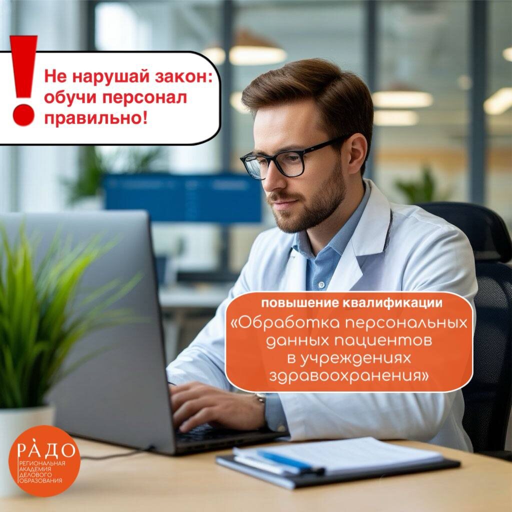 ❗️РАДО рекомендует для СМП программу повышения квалификации среднего медицинского персонала «Обработка персональных данных пациентов в учреждениях здравоохранения», 36 часов. 📌В соответствии с законом, медицинские учреждения выступают в роли операторов персональных данных своих пациентов. Они активно участвуют в различных процессах, связанных с этой информацией - сбор, организацию, хранение, обновление, изменение, передачу и уничтожение. 📄Федеральный закон №152-ФЗ от 27 июля 2006 года "О персональных данных" определяет правила работы с личной информацией, в том числе и в медицинских организациях. 📍В связи с этим, возрастает потребность в повышении квалификации среднего медицинского персонала в сфере обработки персональных данных пациентов, что делает соответствующие образовательные программы особенно важными и востребованными. Учебный план программы состоит из двух модулей: 🔺Информационное обеспечение в сфере здравоохранения 🔺Обработка персональных данных пациентов По оконча