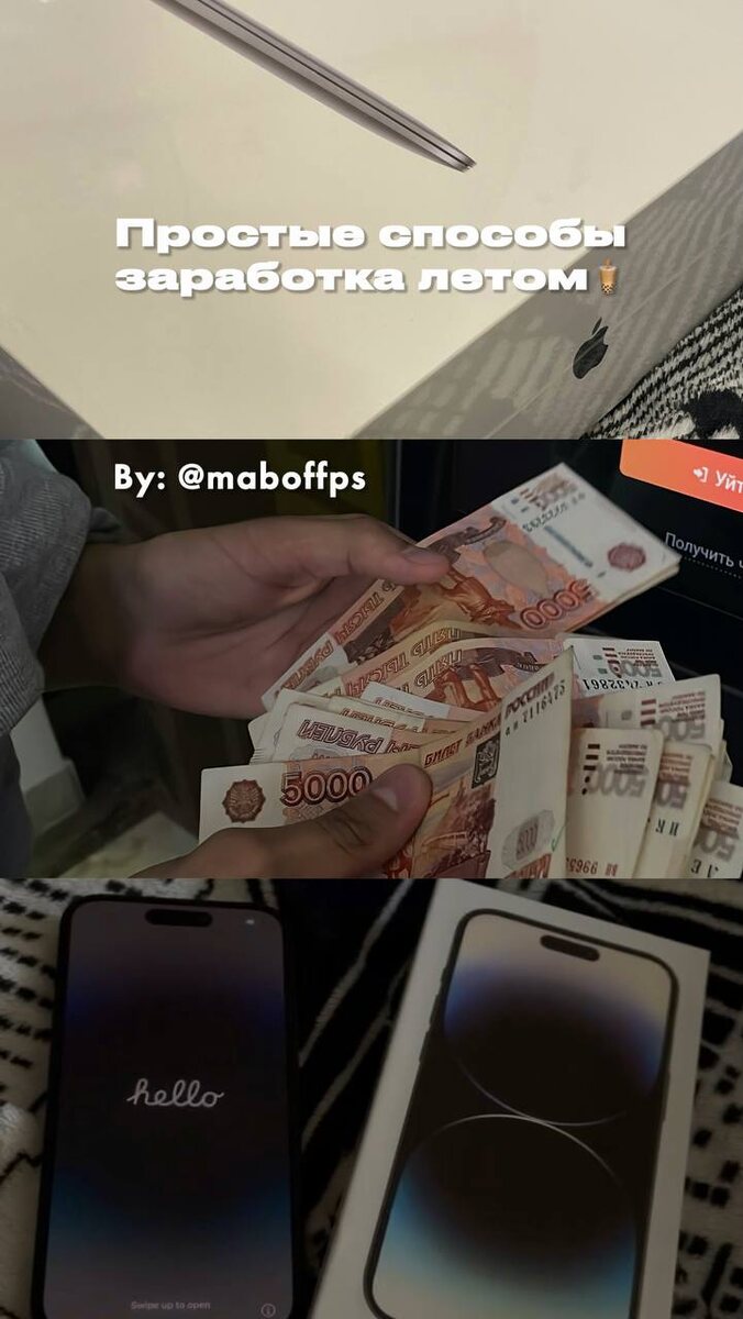 Самые простые способы заработка 💻 Мой предстоящий учебный год обещает быть трудным, поэтому летом я стал больше отдыхать и нашел пассивные (или почти) источники дохода – сохраняйте📌 💸 Расхламление & продажа вещей Избавляетесь от старого -> получаете деньги на новое 💸 Сдача оборудования в аренду Если у вас есть велосипед, камера для съемки или другие подобные вещи, выставите их напрокат под залог 💸 Услуги по выгулу 🐶 Если вы ладите с животными: прогулка на свежем воздухе + деньги + хорошее настроение 💸 Заработок на скачивании приложений Давно упоминал этот способ в своем видео – и он остается одним из любимых, ведь нужен только телефон, и подходит он для всех Инструкция: скачиваем AppStart (на андроид AppBonus), вводим промокод на первое пополнение 3ZR6H7 -> за скачивание одного приложения получаем 4-20₽, вывод без комиссий на любую карту 💸 Мини фотосессии — см фото Важный буст📈 Все заработанные деньги кладем на вклад или накопительный счет, и к сентябрю видим кругленьк