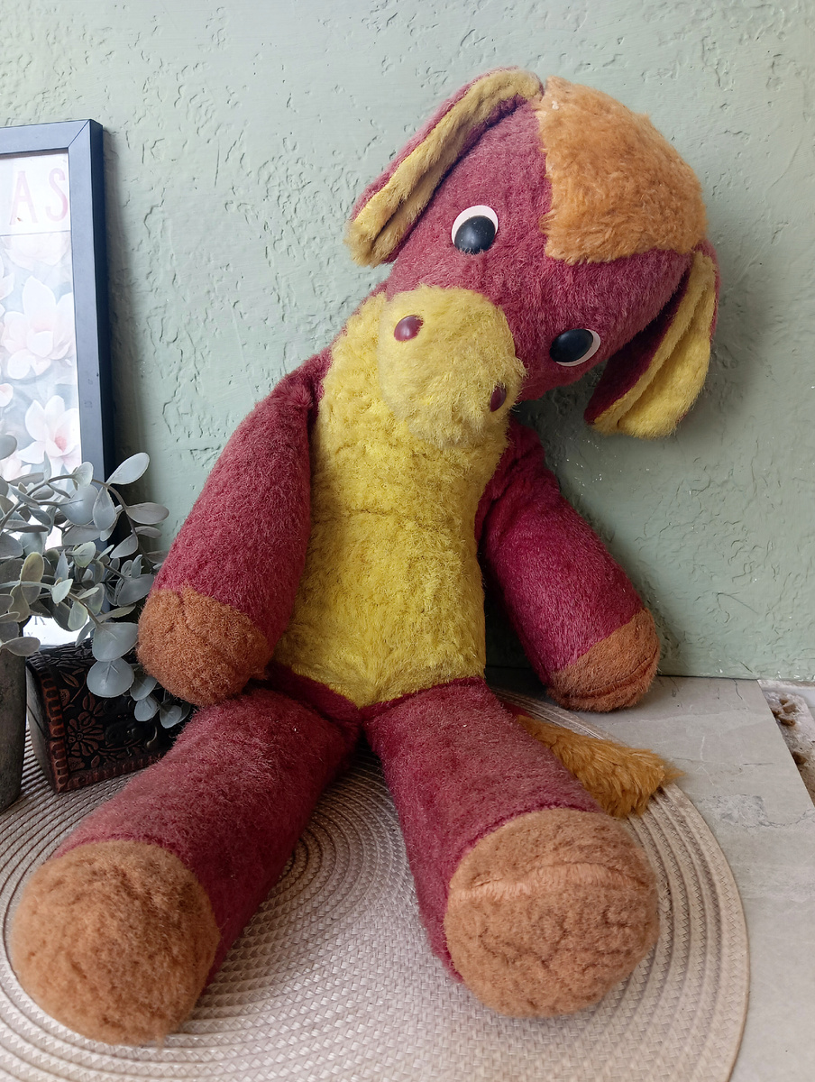 Привет друзья! В этом посте расскажу историю очередного советского ослика, побывавшего у меня в гостях. Предыдущие преображения я снимала на видео в основном, а в этот раз решила изложить его историю и этапы в картинках. Надеюсь, что этим самым я вдохнавлю кого-нибудь на подобные действия со своими любимыми игрушками) Итак начинаем. Началась история с того, что был запрос на моих уже отреставрированных осликов, к тому моменту я уже нашла именно своего, а остальные 3 товарища благополучно нашли свои новые дома. (Привет всем ребятам, надеюсь мамы отпишутся в комментариях) и одна покупательница поинтересовалась о наличии ещё одного, но у меня их уже не осталось, но я пообещала, что буду мониторить объявления и если попадется, то непременно сообщу о находке. И в тот же день увидела ослика в объявлении на известной площадке. Списались с продавцом, и ослик отправился ко мне на Спа процедуры. Вот таким я его увидела первый раз дома. Набивочка уже утратила свою былую упругость. Головушка