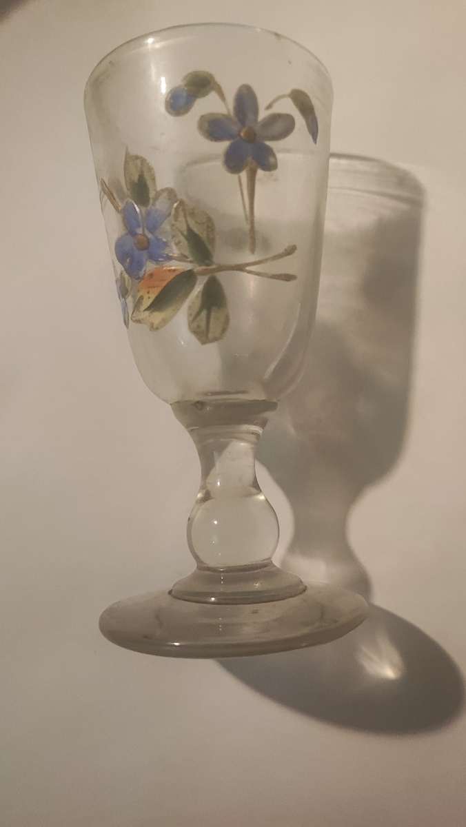 (шутка, но завлекательно - не?) :0)) В 19 веке России коснулась промышленная революция. В том числе - появилось много заводиков по производству косуды. У меня один знакомый - спецом по фарфоровым молочникам. Так вот: он на фабрики Кузнецова: "Фу!" Только по частным заводам. Это я для примера и "... добрым девицам урок". :0) (а чо, хорошо сострил!) :0)) Короче, есть информация, что для улучшения продаж (маркетинг, чтоб его...) на рюмках для "усиления" начали рисовать цветочки. Вот например: С плоской сторны ножки есть "линза". При выдувании - остается огрызок стекла и его срезают. Либо аккуратно - и получается такой кружок. Или грубо: алмазным кругом... И тогда получается вот такая фигура: *.... Или Ж.... А вы, наверно думали "Ж" на донце это для красоты? Не, это обманка, мол, "ручная работа" Увы, на фото поймать линзу не смог. :0( Короче, у меня есть подозрение, что эти вот (ниже) стопки происходят из такого же желания "украсить". Между 1927 и 1953 годом