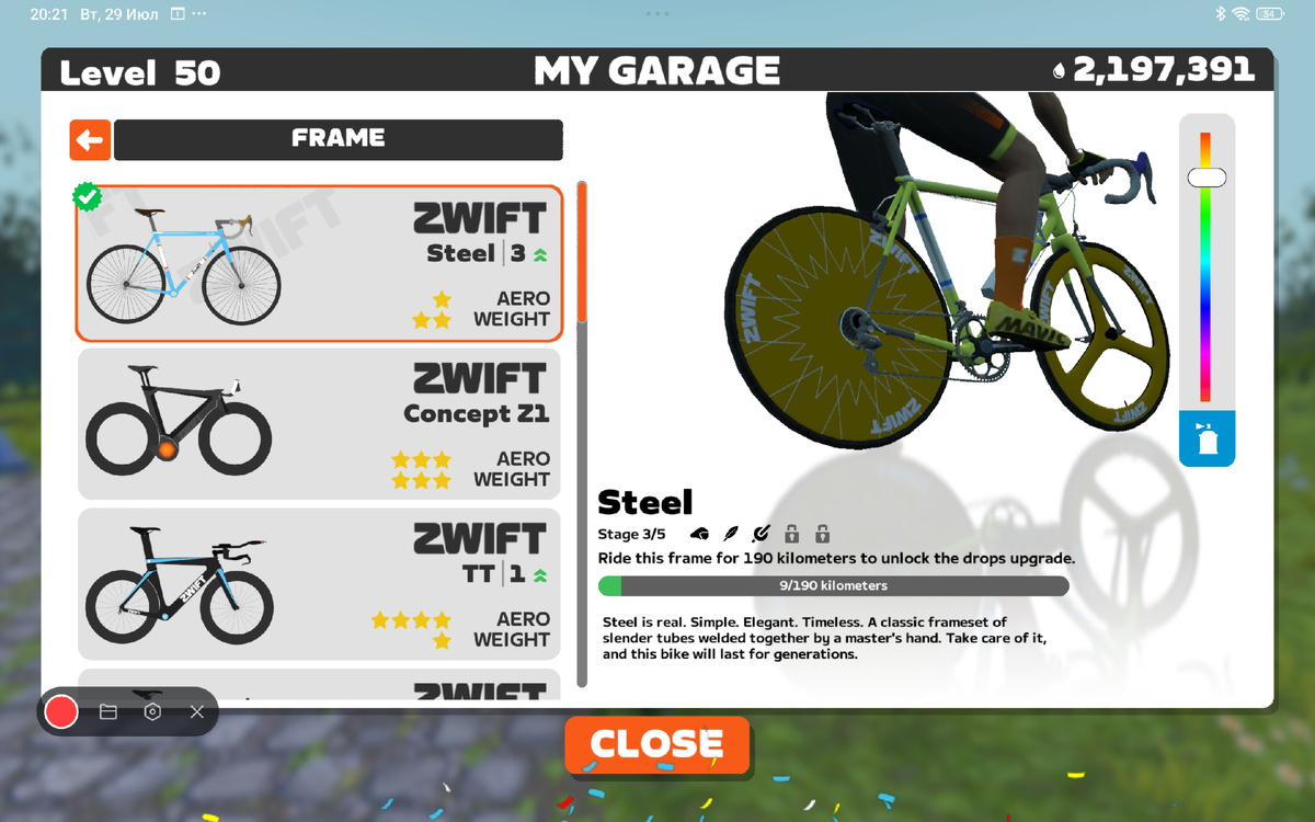 Продолжаю прокачивать до 5-го уровня три велосипеда ZWIFT. Сейчас работаю с велосипедом ZWIFT STEEL, и вчера он был прокачан до 3-го уровня. Логотипом третьего уровня являются шатуны с большой звездой. И для того, чтобы перейти на 4 уровень, необходимо преодолеть 190 километров. Есть над чем работать :)