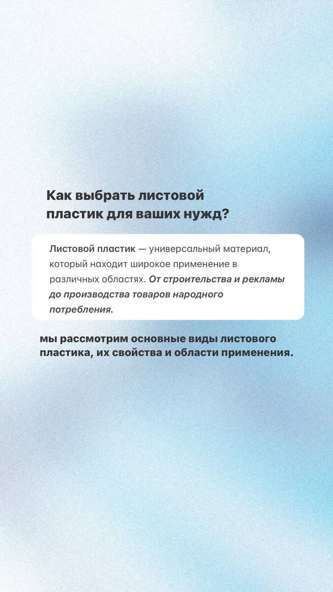 Как выбрать листовой пластик?📂 При выборе листового пластика необходимо учитывать следующие факторы: ✅Область применения. В зависимости от того, для каких целей вы планируете использовать листовой пластик, необходимо выбирать соответствующий вид пластика. ✅Свойства пластика. Различные виды пластика обладают разными свойствами, такими как прочность, гибкость, прозрачность и т. д. Необходимо выбирать пластик с теми свойствами, которые соответствуют вашим требованиям. ✅Цена. Цена листового пластика может варьироваться в зависимости от его вида, толщины и производителя. Надеемся, этот пост поможет вам выбрать подходящий листовой пластик для ваших нужд. Смотреть каталог plast.ru Телефон: +7 (800) 555-52-54 ; +7 (495) 479-00-00 Чат WhatsApp: нажмите, чтобы перейти Чат канала: ↙️