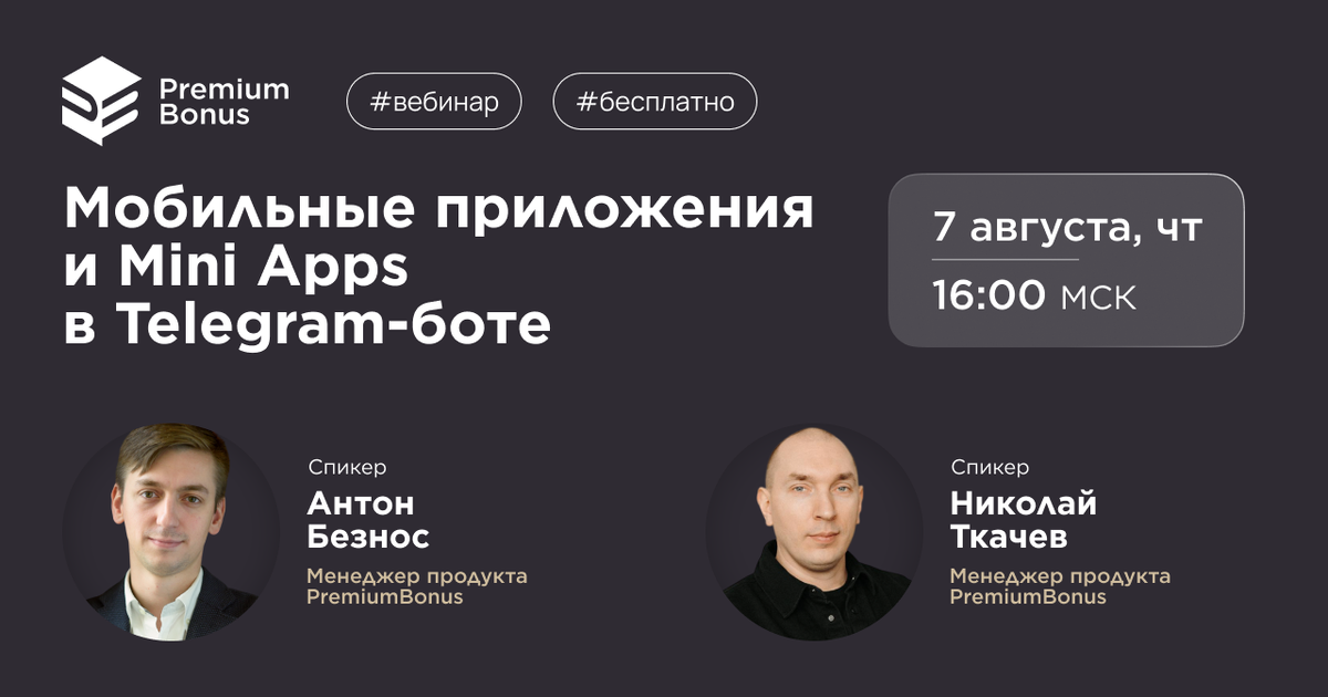 📌Дата и время: 7 августа в 16:00 📣Спикеры: Ведущие менеджеры продукта (Product Owner) PremiumBonus - Антон Безнос и Николай Ткачев Уже через час расскажем, что такое Mini Apps в Telegram-ботах ✈️ и как их использовать! ➡️Подключайтесь по ссылке