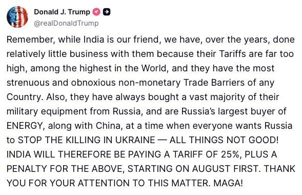 Американский президент написал в соцсети, что с 1 августа вводит 25% пошлину на экспорт Индии в США из-за закупки российских энергоносителей. - Хотя Индия нам друг, мы в последние годы вели с ними не так много бизнеса, потому что у них слишком высокие пошлины, одни из самых высоких в мире, и самые непроницаемые торговые барьеры из всех стран. А еще они всегда покупали большую часть военной техники у России, и являются самым крупным покупателем российских ЭНЕРГОНОСИТЕЛЕЙ, вместе с Китаем, в то время как все хотят, чтобы Россия ПРЕКРАТИЛА УБИЙСТВА В УКРАИНЕ - ВСЕ ЭТО ПЛОХО! ИНДИЯ, ТАКИМ ОБРАЗОМ, БУДЕТ ПЛАТИТЬ ПОШЛИНУ 25%, ПЛЮС НЕСТИ НАКАЗАНИЕ ЗА ПЕРЕЧИСЛЕННОЕ, НАЧИНАЯ С 1 АВГУСТА, - написал Трамп, срываясь на истерику.