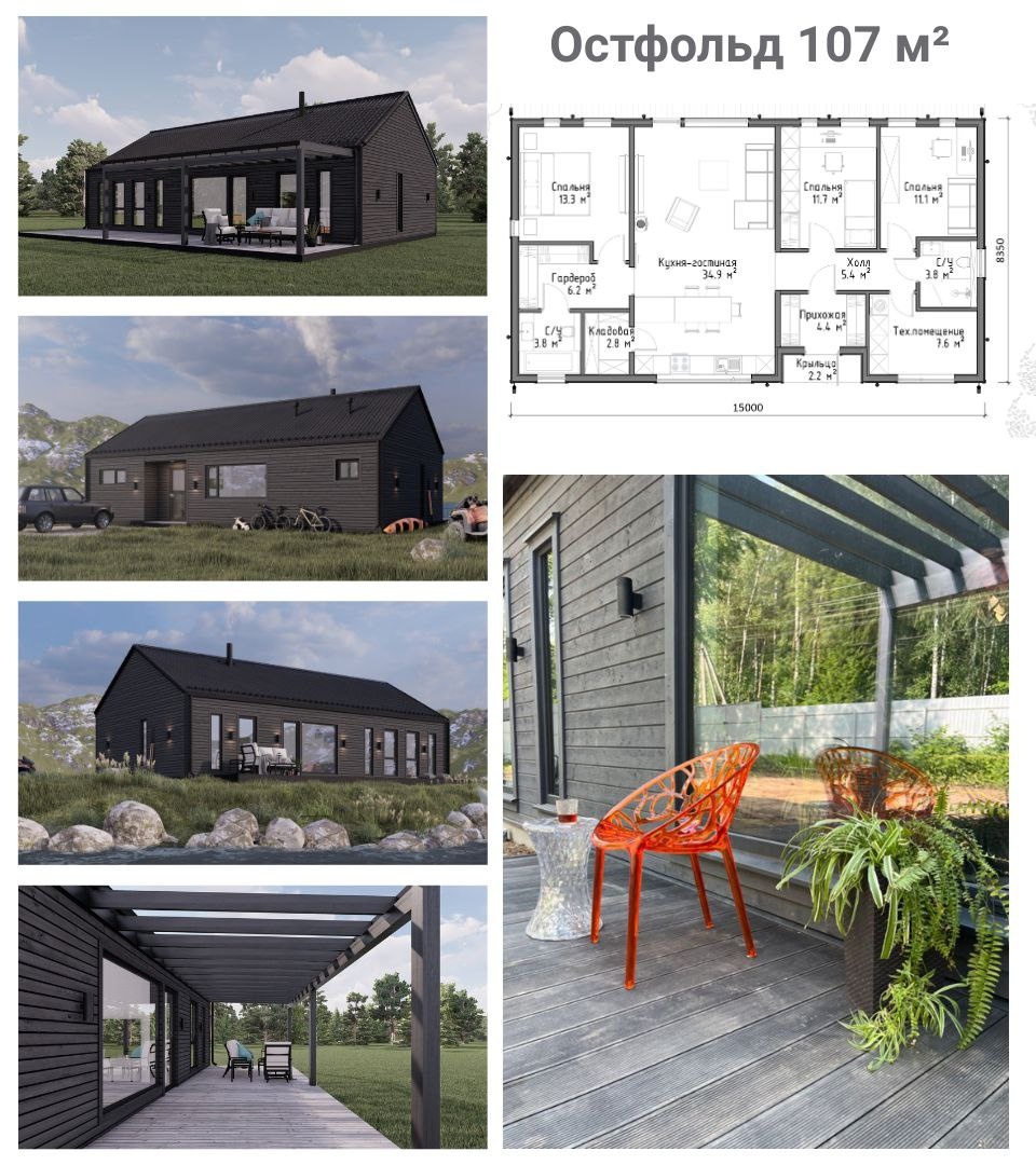 Проект дома «Остфольд» — 107 м² Одноэтажный дом с тремя спальнями, просторной кухней-гостиной и террасой. Рациональный по площади, с продуманным внутренним зонированием дом, который часто выбирают наши заказчики ○ Площадь помещений: 104,8 м² ○ Общая площадь: 107,2 м² ○ Габариты: 15,0 × 8,4 м ○ Этажей: 1 ○ Спален: 3 ○ Санузлов: 2 ✔️ Ключевые особенности дома: • Планировка: мастер-спальня, две детские комнаты, кухня-гостиная формата open-space с выходом на террасу • Зонирование: пространство организовано по принципу разделения — мастер-блок отделён от детской и/или гостевой зоны. • Свет: горизонтальное окно в кухне и большие окна в гостиной обеспечивают естественное освещение в течение дня. • Функциональность: чёткое распределение жилых и хозяйственных помещений: кладовая рядом с кухней, техническое помещение рядом с входом. • Инженерия: УШП, вентиляция с рекуперацией, модульная котельная с автоматикой ZONT и централизованная система охлаждения воздуха Cool box(опция). Подробнее