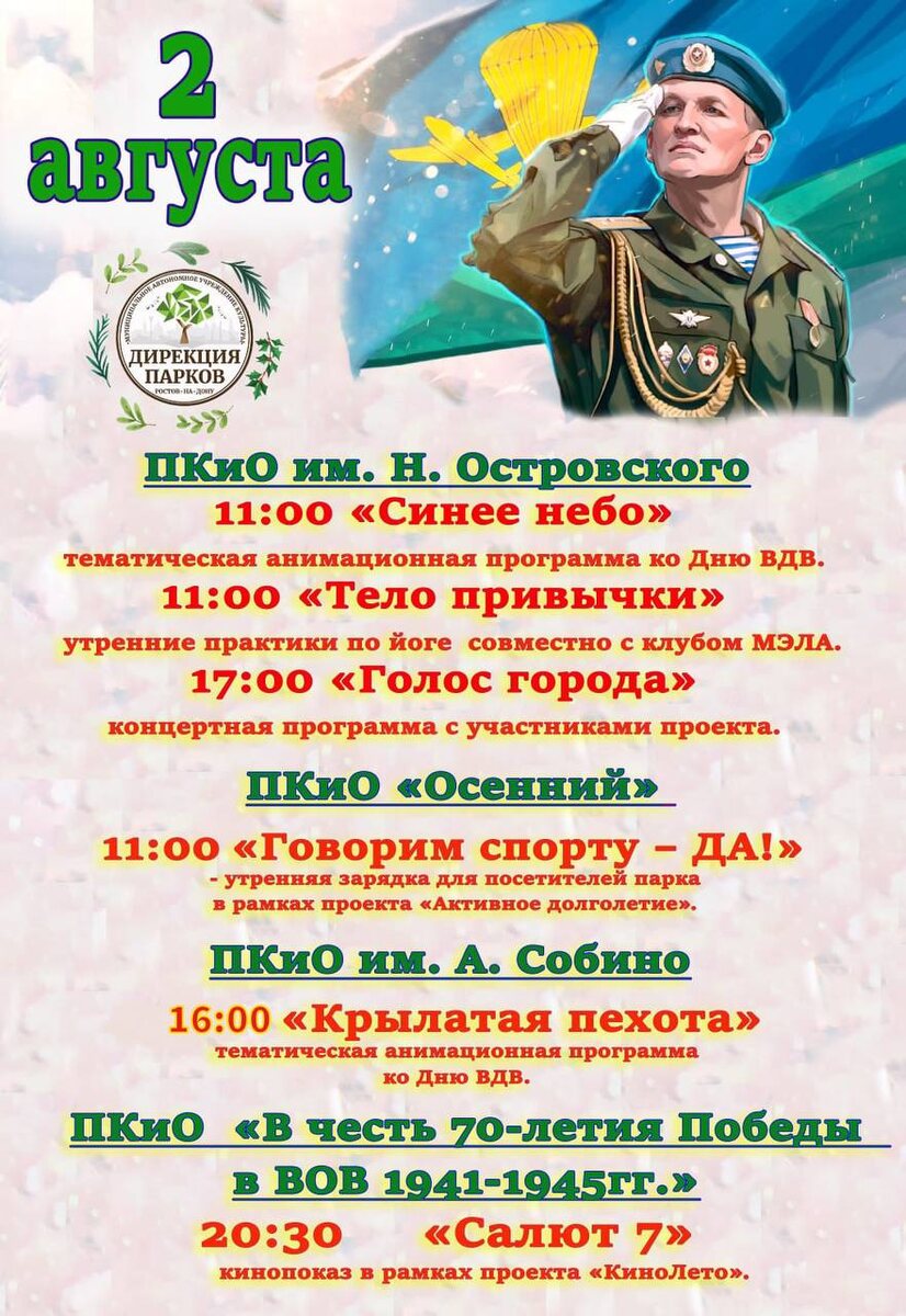💪Ежегодно 2 августа в России отмечается славная дата — День Воздушно-десантных войск (День ВДВ). Дирекция парков решила посвятить мероприятия выходных дней этому замечательному празднику в назидание подростающему поколению! 👉🏻Новости №1 в Ростове 💌Прислать новость/фото
