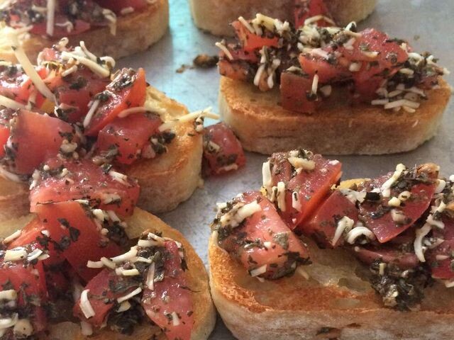 Простая брускетта Я всегда подаю это блюдо в качестве закуски на званых обедах. Всем нравится, потому что она такая легкая и вкусная. ⌛ Подготовка: 10 мин. ⏰ Приготовление: 20 мин. 🍴 Количество: 16 порций Ингредиенты ✅ 1 французский багет, нарезанный кружочками толщиной 1/5.00 см ✅ 8 сливовых помидоров, нарезанных кубиками ✅ 1 чашка рубленого свежего базилика ✅ ½ красного лука, измельченного ✅ свежемолотый черный перец ✅ 3 зубчика чеснока Инструкция приготовления 1. Разогрейте духовку до 200 градусов C. 2. Соедините помидоры, базилик и красный лук в небольшой миске и хорошо перемешайте. Приправьте свежемолотым черным перцем. Отложить в сторону. 3. Разложить хлеб на листе для выпечки. Поместите в духовку и выпекайте до поджаривания, около 5 минут. 4. Выньте хлеб из духовки и переложите на большое блюдо. Дайте хлебу остыть 3-5 минут. Натрите чесноком верхнюю часть каждого ломтика тоста; тост должен блестеть от чеснока. Щедро выложите томатную смесь на каждый ломтик и подавайте.
