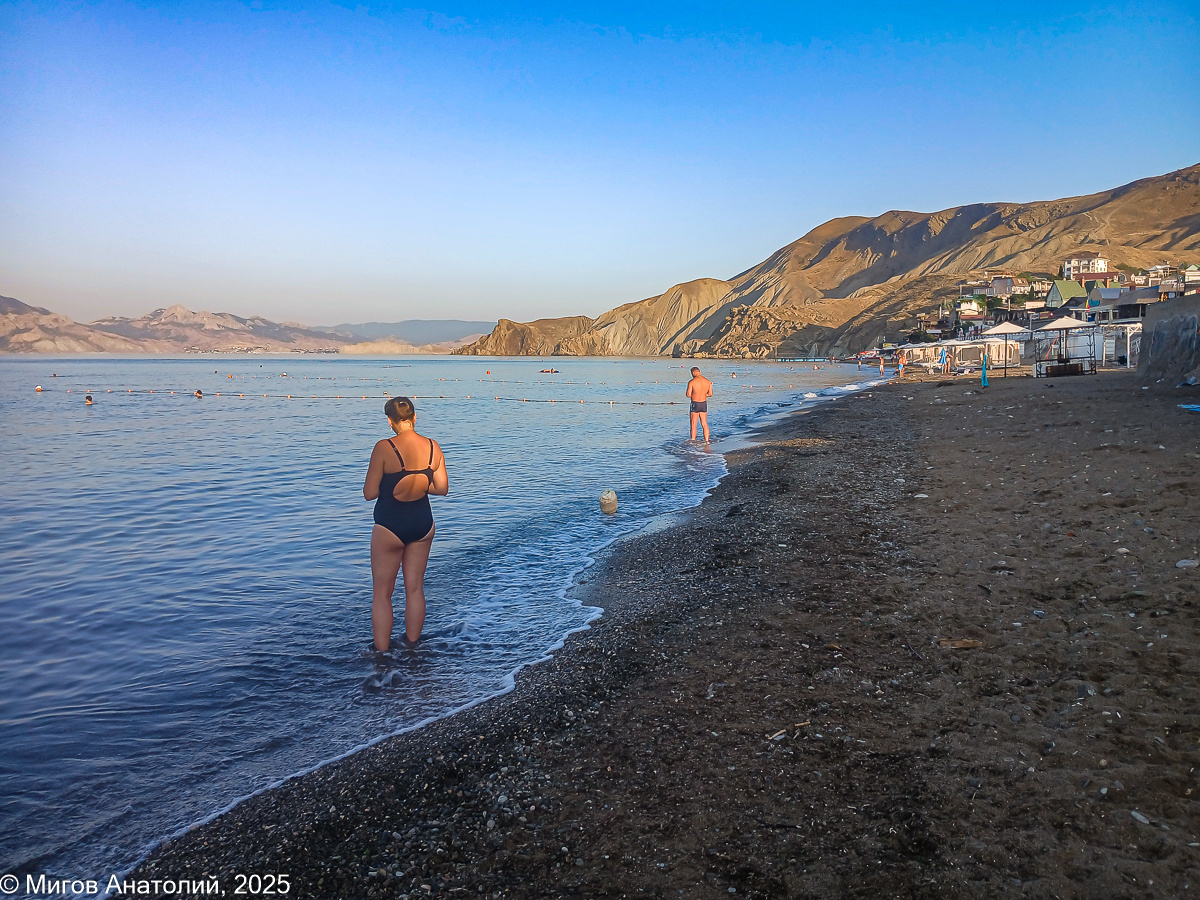 Вчера утром поехали в Орджо - курортный посёлок Орджоникидзе, что в 30 км от нашего Старого Крыма. Я слегка переживал, что море может разыграться и поплавать у нас не получится. Два дня назад, когда мы купались в Феодосийском заливе, море было неспокойным. Но на деле оказалось, что такой спокойной, чистой и тёплой воды, какой она оказалась в бухте Провато, мы в этом году ещё не видели. Ехать нам до парковки рядом с Центральным пляжем всего полчаса. В 6 утра выехали, в половину седьмого уже паркуемся. Машин утром мало. Но уже через полтора-два часа вся обочина здесь (на фото внизу) будет плотно забита легковушками. Про то, что море сегодня будет тихим и ласковым, мы поняли, когда нам открылась Двуякорная бухта. Над морем стояла дымка, а поверхность воды была ровной. Двуякорная бухта - это тоже Орджо, только она с восточной стороны поселка, ближе к Феодосии. А бухта Провато ближе к Коктебелю. Двуякорная не такая популярная как Провато. Места здесь более дикие и, соответственно, пляжи тож