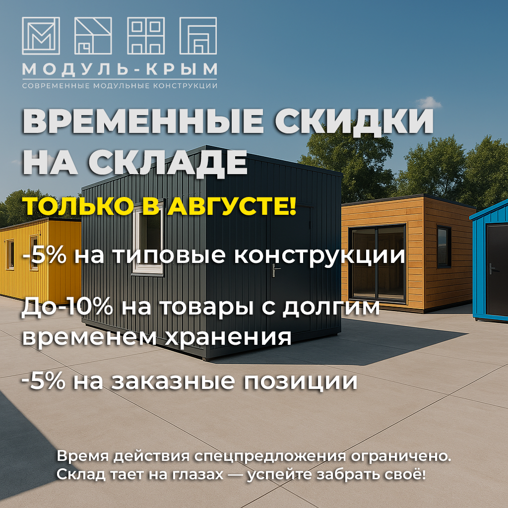 Всё, что накопилось - бытовки, блок-контейнеры, модули - идёт со скидкой до -10%. Типовые изделия - минус 5%, Залежавшиеся - до 10%, Индивидуальные заказы - тоже до 5% 📍 Симферополь и Донецк. 📦 Модули есть в наличии, можно забирать хоть завтра. Если вы уже интересовались - сейчас самое время вернуться к диалогу 😉 Условия оплаты те же, скидка не влияет. 🕒 Предложение действительно до конца августа. Звонки и сообщения принимаем также в WhatsApp и Telegram Отдел продаж в Крыму: +7 (978) 115-14-15 +7 (978) 094-44-56 Симферополь, Трасса "Таврида", Живописное шоссе 5, офис 1 (развязка Трудовое — Урожайное) modul-crimea.ru