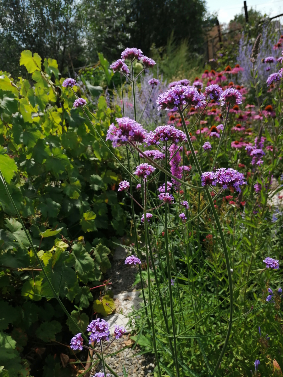 Сегодня просто обитатели природного цветника и немного того, что рядом. Самый пик, однако. Вербена бонарская одновременно и солист, и фон. Цветут мордовники и перовскии. Наконец есть пространство для ажурных соцветий кермека широколистного. Хоть собирай семена и сей заново - второй куст из зимы не вышел, а этот посажен неудачно - его обычно давит катананхе. А она ж на будущий год снова отрастет... Как ни странно, гальтонии нынче относительно невысокие. Им подпевает белая лиатрис - на сей раз кентрантус отцвел раньше и композиции не получилось. Два куста флоксов таки поимели совесть и пытаются выполнять свою задачу - работать ярким пятном на фоне зелени: Вообще с ними получилось довольно удачно, на мой взгляд - они дают яркое пятно в конце основного природного цветника и одновременно видны через цветник с гальтониями. Суетятся всякие леталы и жужжалы: А вот, кстати, самосевная амми большая, выросшая на приглянувшемся ей месте. Реально большая: Гаура, щучка, эхинацея. Фоном перовски
