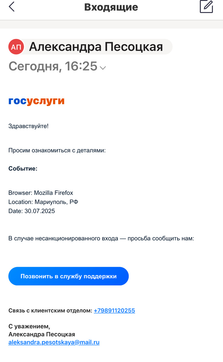 Что делать? Пришло письмо с логотипом "госуслуги" на электронную почту, совершен вход из Мариуполя. Я позвонил и был послан