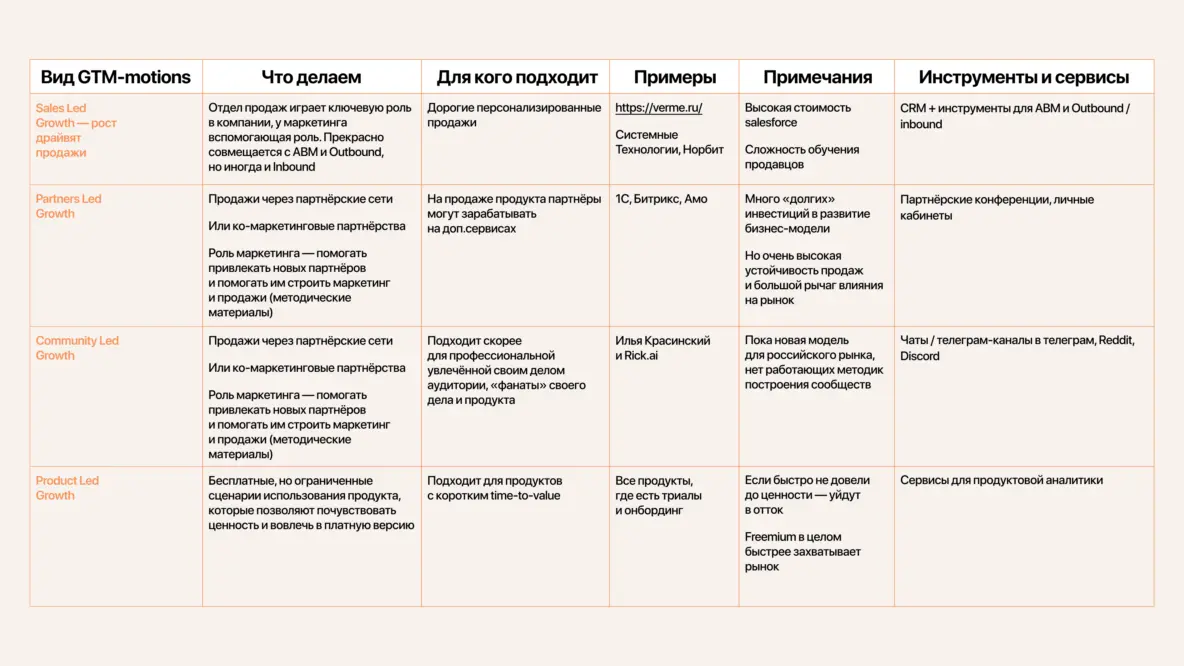 Вот как выглядит список основных Go-to-Market Motions.