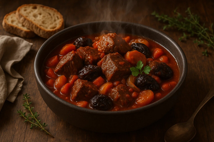 Есть у меня одно фирменное блюдо, которое выручает всегда. Надо встретить гостей, пожалуйста. Хочется побаловать семью на выходных, да легко. А иногда просто душа просит чего-то уютного, ароматного и нежного. Вот тут на сцену и выходит она, тушёная говядина с черносливом и курагой. Казалось бы, мясо и сухофрукты, не самый очевидный тандем. Но попробуйте, и убедитесь: это настоящая гастрономическая сказка с восточным акцентом. Ингредиенты: (На 4 порции - как раз для тёплого домашнего ужина) Говядина (лучше лопатка или грудинка) - 800 г. Чернослив - 100 г. Курага - 100 г. Лук репчатый - 2 средних. Морковь - 1 крупная. Чеснок - 3-4 зубчика. Томатная паста - 1 ст. ложка (или помидоры - 2 шт) Вода или мясной бульон - 500-700 мл. Растительное масло - для жарки. Соль, чёрный перец - по вкусу. Специи: зира, кориандр, немного корицы (по желанию) Лавровый лист - 2 штуки. Приготовление: Сначала займёмся мясом. Нарезаем говядину на крупные кубики, такие, чтобы на вилку удобно было наколоть, и не р