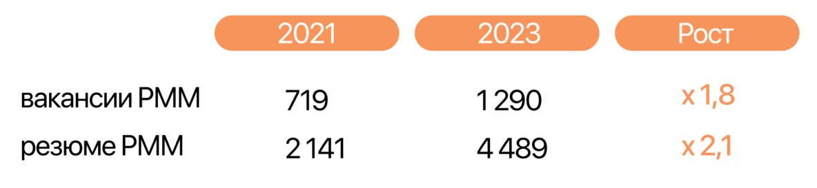 Самая первая вакансия PMM в России была размещена в 2003 году, а сегодня каждый второй PMM уже менял место работы минимум 1 раз. С 2021 года, за два года, количество вакансий и резюме выросли почти в 2 раза. По данным ретроспективного анализа hh.ru количество опубликованных вакансий в 2021 и в 2023 годах выросло в 1,8 раз, количество опубликованных резюме - в 2,1 раза.