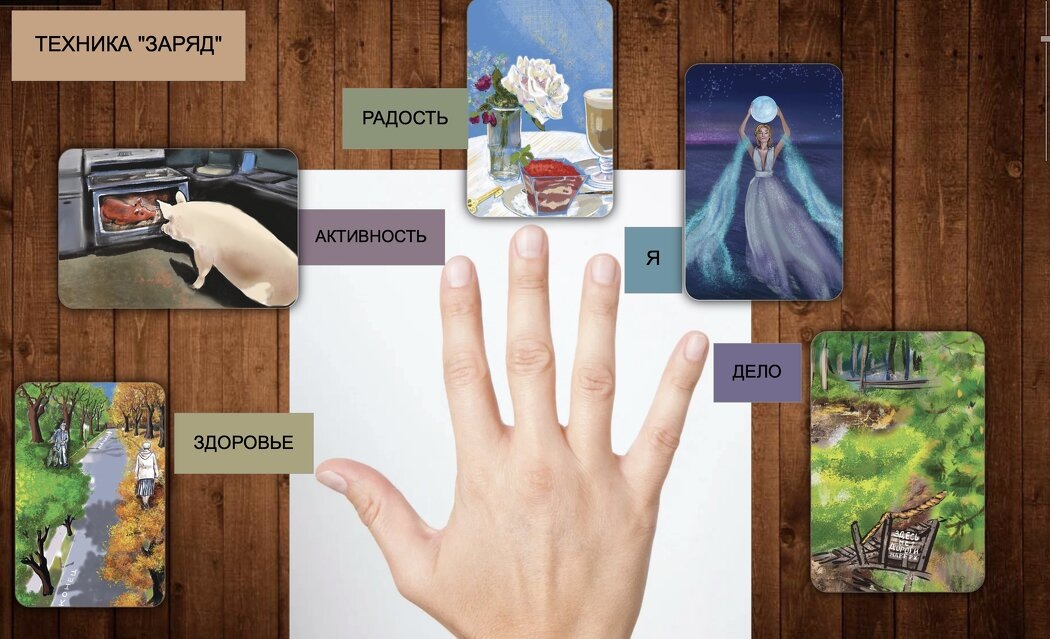 Здравствуйте, коллеги! Сегодня хочу предложить вам свою версию известного метода «Пять пальцев», который помогает структурно подводить итоги прожитого дня. Идея создания такого подхода, по разным источникам, принадлежит Бодо Шеферу, известному бизнес-тренеру и Лотару Зайверту, который считается ведущим экспертом по тайм-менеджменту в Германии и Европе. Технику я назвала «Заряд» и предлагаю ее использовать для диагностики состояния клиента и помощи при выявлении запроса для работы. Для работы понадобится любая универсальная колода. В данном случае я использовала свои авторские МАК "Во сне и наяву". Инструкция 1. Предлагаем клиенту нарисовать контур кисти или берем заготовленный шаблон. 2. Далее договариваемся, что каждый палец будет отвечать за определенную сферу жизни человека, которые влияют на его состояние и подписываем их. - Большой палец - З ( здоровье). - Указательный - А ( активность). - Средний - Р ( радость ). - Безымянный. - Я ( самоощущение). - Мизинец - Д ( дело ). Обратит