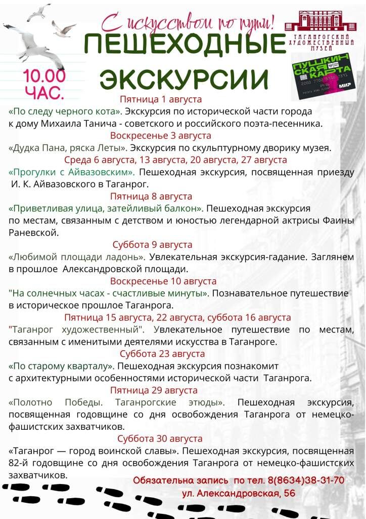 В августе Таганрогский художественный музей приглашает гостей и жителей города на интересные и познавательные пешеходные экскурсии, участники которых узнают много интересных фактов из истории Таганрога. В пятницу, 1 августа, участников мероприятия ждет экскурсия «По следу черного кота» — по исторической части города к дому Михаила Танича — советского и российского поэта-песенника. В воскресенье, 3 августа — экскурсия «Дудка Пана, ряска Леты» по скульптурному дворику музея. По средам, 6 августа, 13 августа, 20 августа, 27 августа, пройдут экскурсии «Прогулки с Айвазовским», посвященные приезду художника в Таганрог. В пятницу, 8 августа состоится пешеходная экскурсия «Приветливая улица, затейливый балкон» — по местам, связанным с детством и юностью легендарной актрисы Фаины Раневской. В субботу, 9 августа запланирована увлекательная экскурсия-гадание «Любимой площади ладонь», которая расскажет о прошлом Александровской площади. В воскресенье, 10 августа: «На солнечных часах — счастливые