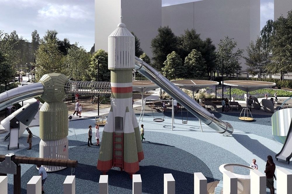 Проект сквера на тему космоса во дворе строящегося ЖК «Притяжение» (на месте снесенного ДК имени 50-летия Октября).