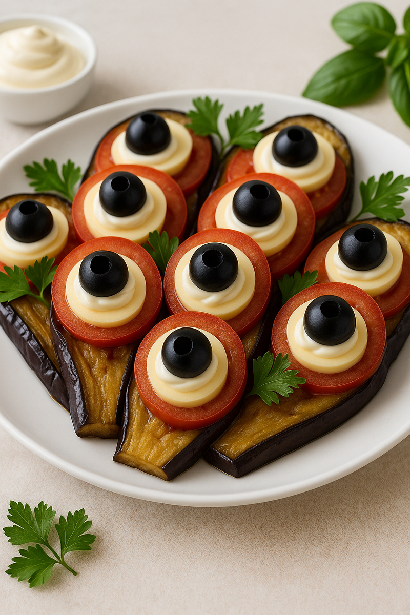 Это холодная (или тёплая) закуска, выкладываемая в виде веера — ломтики баклажанов чередуются с помидорами, сыром, зеленью, маслинами или другими яркими ингредиентами. Основу обычно запекают, а сверху выкладывают свежие или запечённые добавки. Главное — красивая подача и гармония вкуса.