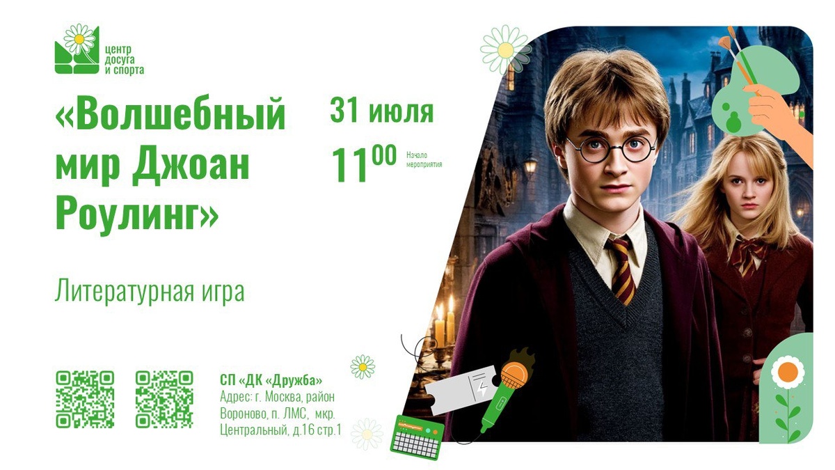 📚 Приглашаем на литературную игру, посвящённую юбилею Джоан Роулинг и её культовой саге о Гарри Поттере! Погрузитесь в волшебный мир, полный тайн и приключений! Вас ждут захватывающие задания, викторины и незабываемые впечатления. 📅 Когда: 31 июля в 11:00 📍 Где: район Вороново, п. ЛМС, мкр. Центральный, д.16 стр. 1 Не пропустите возможность провести время интересно и с пользой! #новоститинао #анонсытинао #анонсывороново