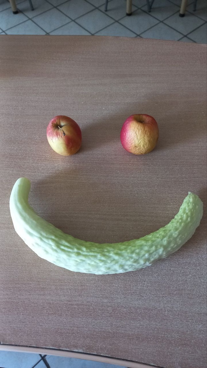 Всем привет! Сегодня у нас неожиданный и креативный завтрак был, который подарил нам массу положительных эмоций! Мы решили поэкспериментировать и создать смайлик из белого огурца и двух яблок.
