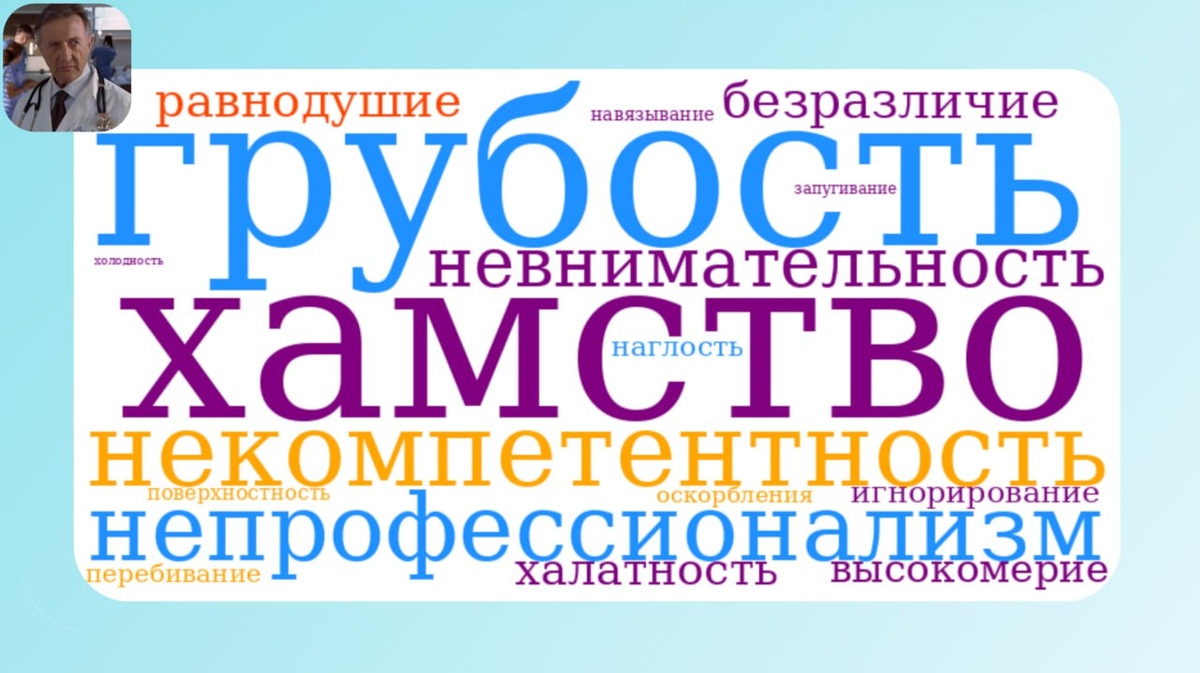 Сегодня мы решили выяснить, какие слова пациенты чаще всего используют в негативных отзывах, описывая врача. В этот раз нам снова помог доктор Иван Келсович — тот самый, что раньше раздавал вредные советы. Теперь он представляет вашему вниманию другой список. На вершине — «грубость» и «хамство». Они встречаются в отзывах больше тысячи раз. Ниже — «непрофессионализм», «безразличие» и «высокомерие». А замыкают этот рейтинг «поверхностность» и «холодность» — менее частые, но не менее важные. Каждое из этих слов — не про диагностику и лечение, а про то, что остаётся в памяти надолго. Иногда всё, что нужно — немного внимания, чуть больше терпения. И тогда такие списки просто перестанут существовать.