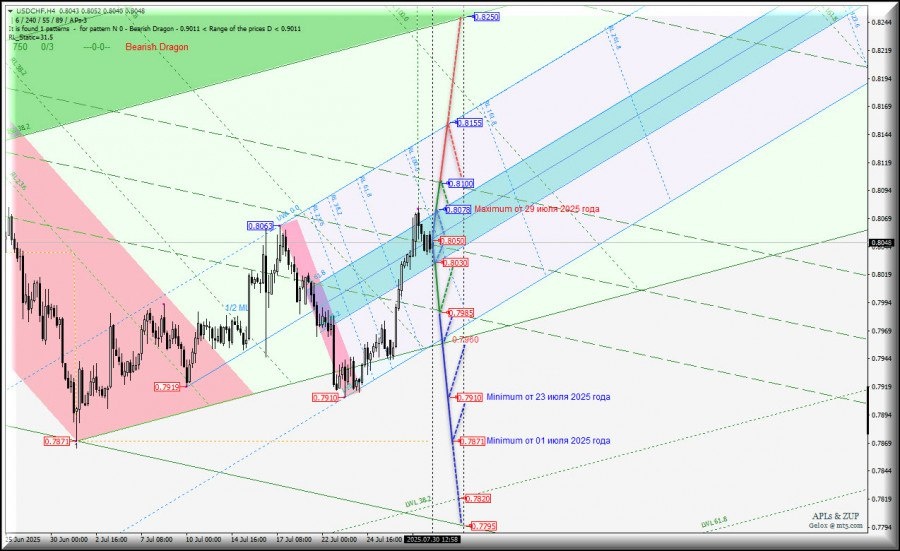 https://basechop.ru/wordpress/?p=51780 Операционный масштаб Minor (таймфрейм h4) USD/CHF – h4 – обзор вариантов развития движения данного валютного инструмента с 30 июля 2025 г. Предыдущий обзор US Dollar vs Swiss Franc(таймфрейм h4) от 28.07.2025 г. 09:55 ___________________ US Dollar vs Swiss Franc Развитие движения USD/CHF-h4 с 30 июля 2025 года будет обусловлено границами канала 1/2 Median Line (0.7985 – 0.8050 – 0.8100) вил старшего операционного масштаба Minute-h4 и направление оного движения станет определяться отработкой и направлением пробоя границ зоны равновесия (0.8030 – 0.8050 – 0.8078 (maximum от 29 июля 2025 года)) вил младшего операционного масштаба Minuette-h1. Восходящее движение. При пробое уровня сопротивления 0.8078 (maximum от 29 июля 2025 года) на верхней границе ISL61.8 зоны равновесия вил младшего операционного масштаба Minuette-h1 восходящее движение швейцарского франка может быть продолжено к верхней границе канала 1/2 Median Line (0.8100) вил старшего