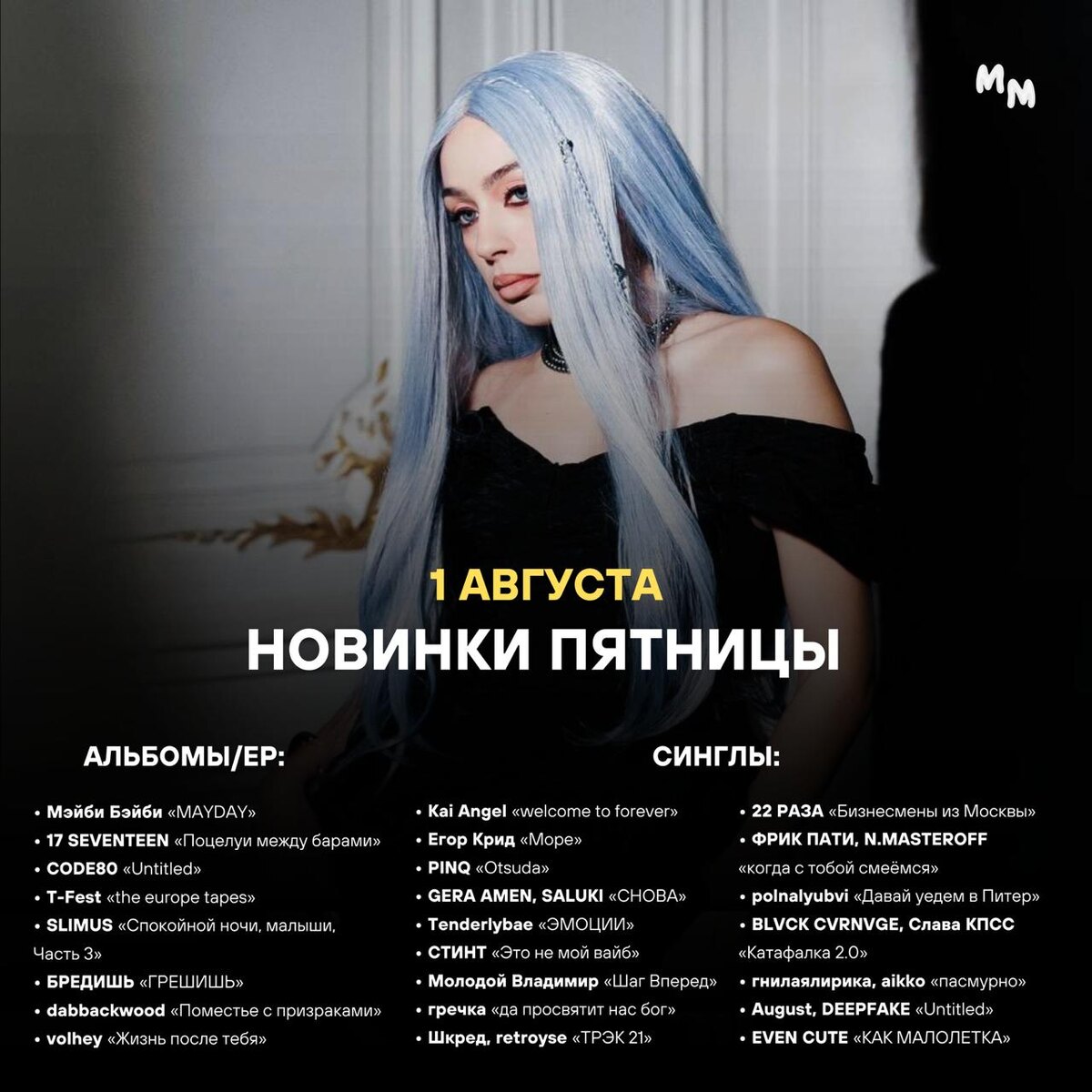 🗓 НОВИНКИ ПЯТНИЦЫ — 1 АВГУСТА Альбомы/EP: • Мэйби Бэйби «MAYDAY» • 17 SEVENTEEN «Поцелуи между барами» • T-Fest «the europe tapes» • SLIMUS «Спокойной ночи, малыши, Часть 3» • БРЕДИШЬ «ГРЕШИШЬ» • dabbackwood «Поместье с призраками» • volhey «Жизнь после тебя» • whyspurky «cherchez la femme» • макулатура «8 жизней» Синглы: • Kai Angel «welcome to forever» • Шайни «Время» • Егор Крид «Море» • PINQ «Otsuda» • GERA AMEN, SALUKI «СНОВА» • Tenderlybae «ЭМОЦИИ» • СТИНТ «Это не мой вайб» • Молодой Владимир «Шаг Вперед» • гречка «да просвятит нас бог» • Шкред, retroyse «ТРЭК 21» • 22 РАЗА «Бизнесмены из Москвы» • ФРИК ПАТИ, N.MASTEROFF «когда с тобой смеёмся» • polnalyubvi «Давай уедем в Питер» • LAVBLAST, Saint City Lovers «Лето в городе» • BLVCK CVRNVGE, Слава КПСС «Катафалка 2.0» • гнилаялирика, aikko «пасмурно» • AUGUST, DEEPFAKE «Untitled» • EVEN CUTE «КАК МАЛОЛЕТКА» • Blazergosicko, Vizzyx «СКАЖИ МНЕ» • BRAU, RAM «ГРИЛЬ» • Sabi, MIA BOYKA «Базовый минимум» • Enina «Отменить» • Mary G