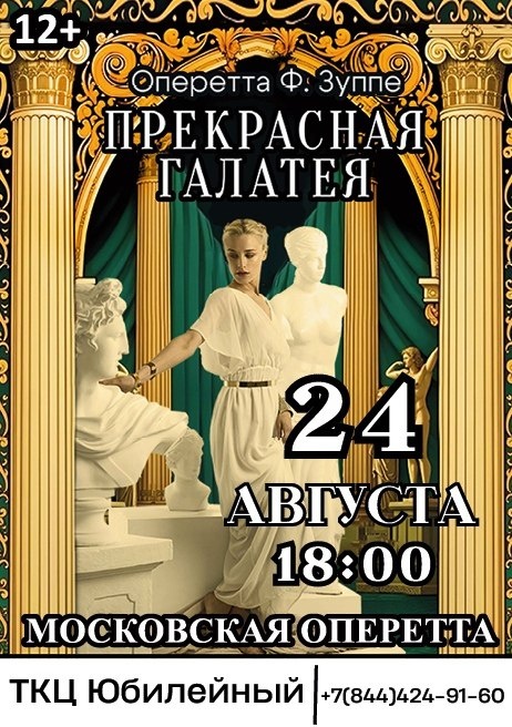 🎭 Спешите увидеть комедийную постановку «Прекрасная Галатея» в ТКЦ "Юбилейный"🎉 24 августа в 18:00 артисты Московского театра оперетты представят зрителям веселый и зажигательный спектакль-комедию знаменитого австрийского композитора Франца фон Зуппе — «Прекрасная Галатея». 🌟 ✨ Вас ждут яркие костюмы, захватывающая музыка и незабываемые эмоции! 🏻 Билеты уже продаются в кассе ТКЦ «Юбилейный». Спешите насладиться прекрасным вечером вместе с театром оперетты! #новостикультуры #ТЦКЮбилейный