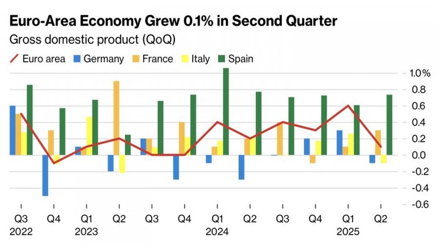 https://basechop.ru/wordpress/?p=51791 Тарифы Дональда Трампа уже начинают кусаться. Еврозона едва избежала стагнации, а экономика Германии сократилась на 0,1% во втором квартале из-за политики протекционизма США и все еще вялого внутреннего спроса. Рост американских пошлин на импорт до 15% позволяет утверждать, что на протяжении оставшейся части года валютный блок будет демонстрировать очень скромную динамику ВВП. Контраст с возвращающимися к бурному росту Соединенными Штатами налицо. Почему бы EUR/USD не падать? Динамика европейских экономик Еще в начале недели к 1 августа эксперты Bloomberg прогнозировали, что валовой внутренний продукт США в апреле-июне расширится на 2,4%. Однако после сильной статистики по внешней торговле опережающий индикатор от ФРБ Атланты увеличил цифру до 2,9%. По факту оказалось 3%. Благодарить за это нужно чистый экспорт, который добавил к ВВП 5 п.п. В январе-марте из-за падения индикатора американская экономика сократилась на 0,5%. Таким образом, если в