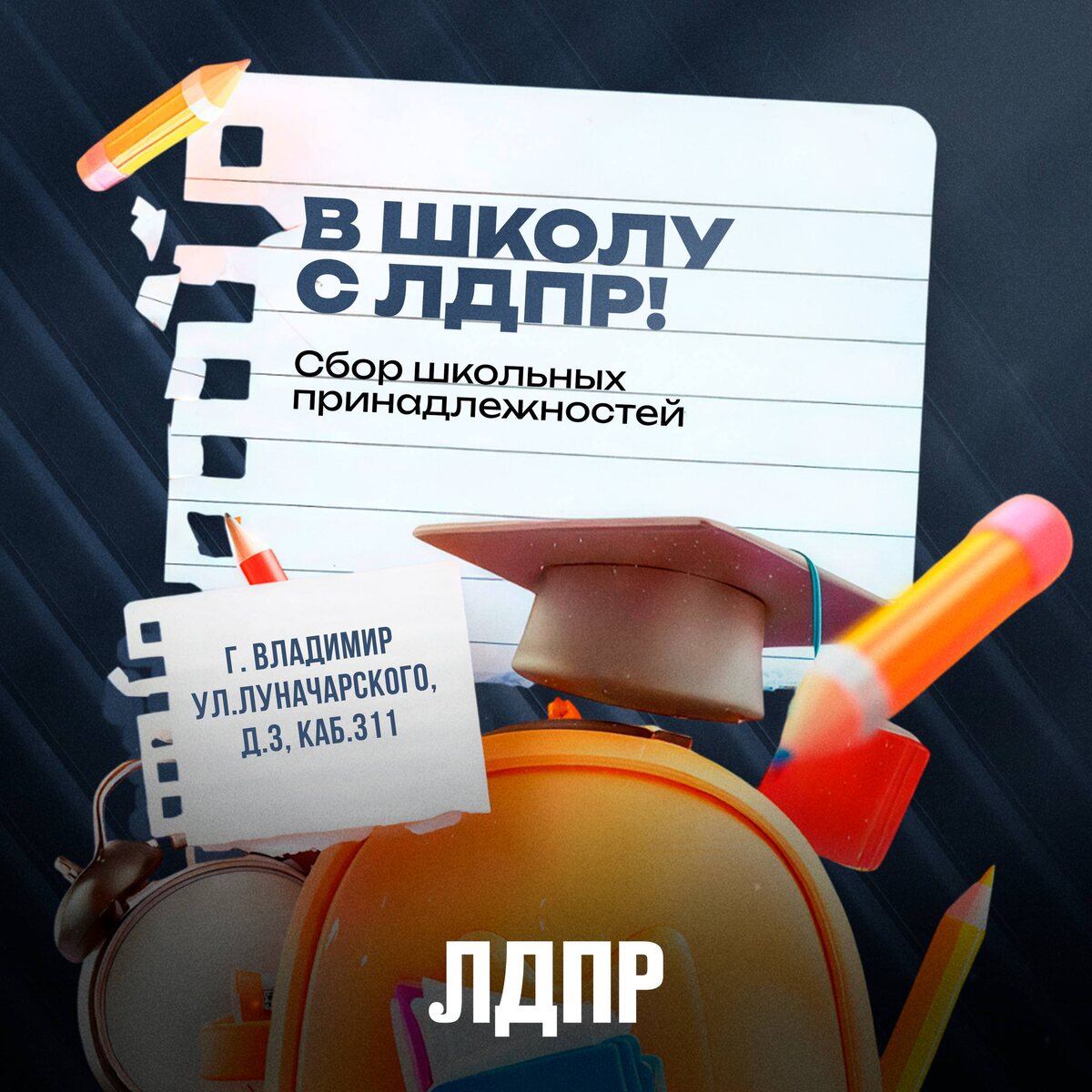 В школу с ЛДПР!🎓 Для многих семей подготовка к новому учебному году — тяжелое бремя. Высокие цены на учебные принадлежности бьют по карману. Акция в школу с ЛДПР помогает собрать в школу детей из малообеспеченных и многодетных семей. Даже небольшой вклад может стать большой помощью! Приносите школьные принадлежности во Владимирское региональное отделение ЛДПР и сделайте доброе дело! 📍Адрес: г.Владимир, ул.Луначарского д.3, каб.311.