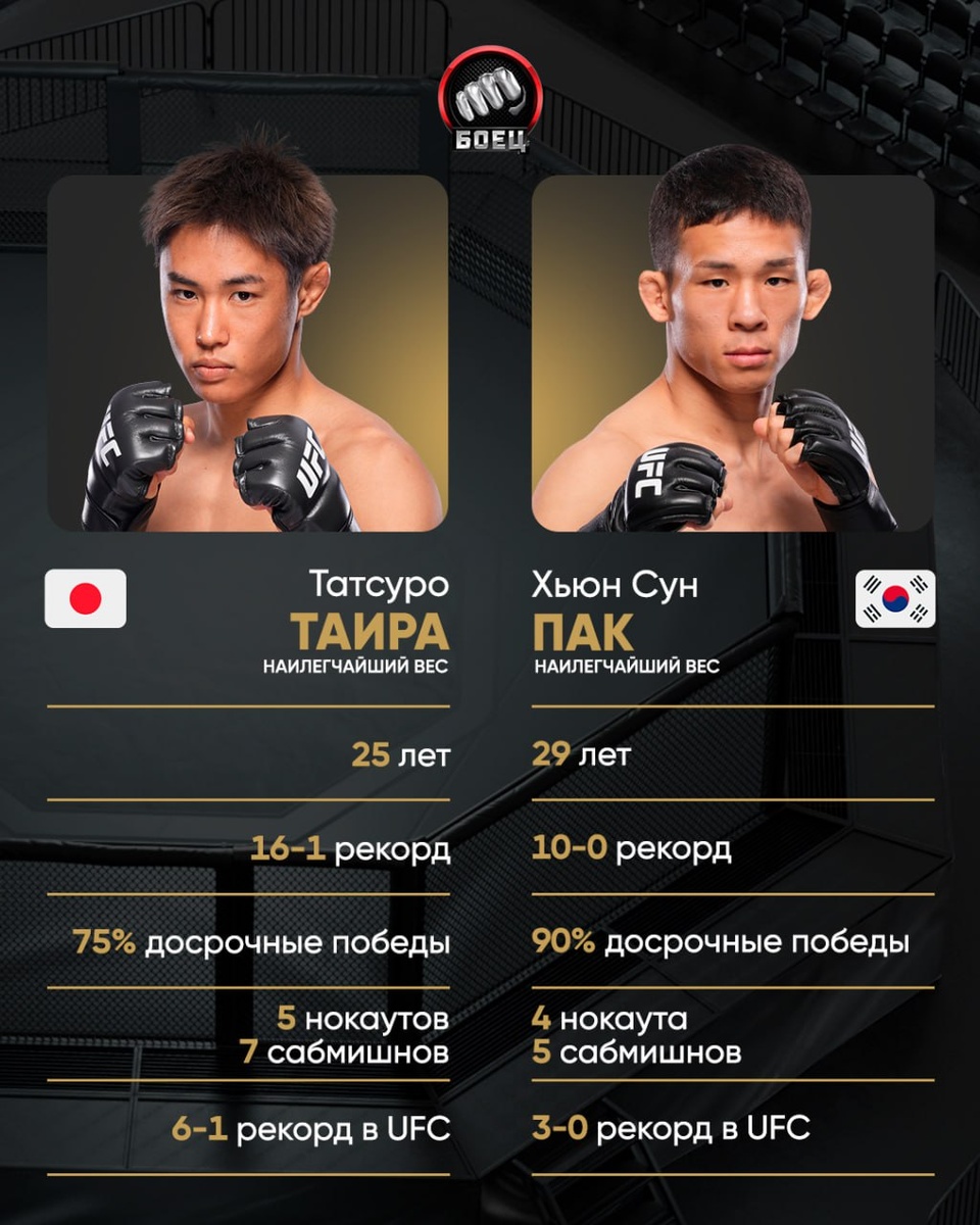 Вот такой главный бой ожидает на UFC Вегас 108 ⚔️ Таира 🆚 Пак Татсуро шел на шикарной серии из шести побед, однако Ройвал прервал этот стрик и нанес японцу первое поражение ❌ Хьюн Сун получил свой первый главный бой в промоушене. Пока он не знает поражений, а в UFC у него три победы в трех поединках 👊