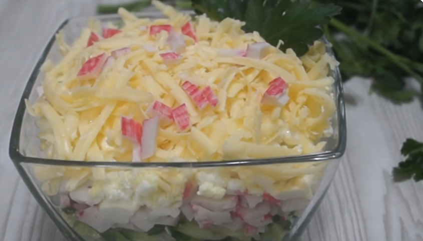 4 слой - равномерно посыпаем верх тертым сыром. Сверху можно украсить зеленью и крабовой палочкой.